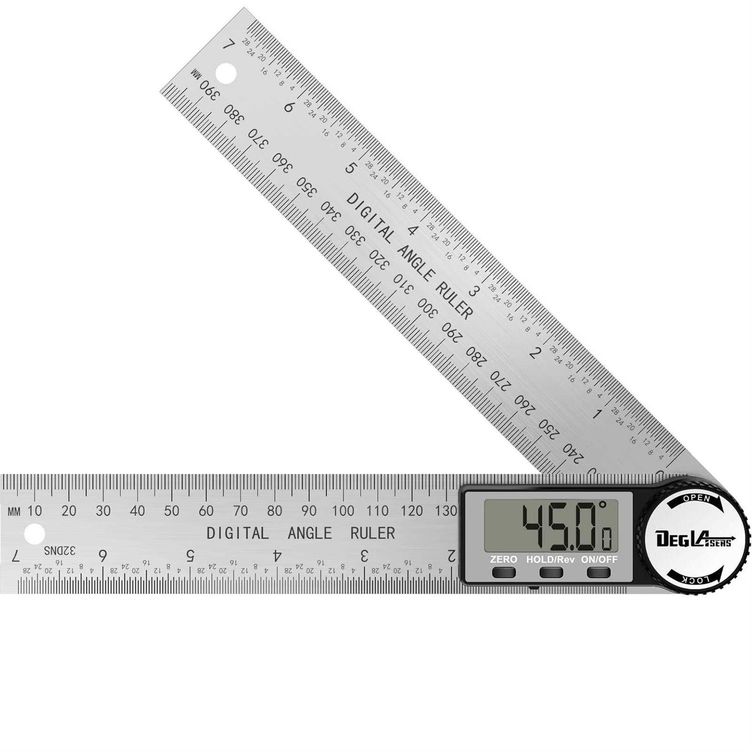 [2 in 1 Digital Angle Finder]It is 2-in-1 digital display angle ruler for measuring lengths and angles, both internal and external. The combination of a millimetre and inch scale ruler and a protractor makes it easy to measure internal and external angles. Great gift for dads, men and women who work in woodworking, construction, engineering. [Stainless Steel Digital Protractor]The stainless steel material is hard and durable, which can prolong the service time of this protractor. Laser etched measurements offer clear reading and years’ usage. [High Accuracy & 360° Measurement Measure Angles Tool]Accuracy of this digital angle gauge is ±0.3 degree. The ruler supports measurement between metric(mm) and imperial(inch), makes it can measure length (0~200 mm/0~7 inch) convenient and accurately.Hinge mechanism on the angle rule allows a full range of 0 to 360-degrees to measure inside outside and reverse angles. [Angle Finder with LCD Display & Locking Function]Angle Finder Protractor comes with a large easy-to-read LCD display. For read it easily, this woodworking tool could be locked at any angle,and has zeroing button to reset angle finder tool at any time. It also comes with a Reverse Function Button, When you measuring large angle and doing reverse measurement,the display could read up-side-down.The function of automatic shut-off after 6 min saves energy of the battery. [Easy Operation & Wide Application Angle Protractor ]Many uses, for example as miter saw protractor or for checking angle of blade on table saw or accuracy of miter saw, making angle cuts or measurements, trim / wall / corner angle measuring, bending tubing and metal sheets. Caution: This protractor for woodworking has sharp corners. Handle with necessary care. *SCRATCHES ON RULERS ARE RESULTED FROM TOUCHING WITH EACH OTHER. IT MAY APPEAR ON BRAND-NEW PRODUCT.