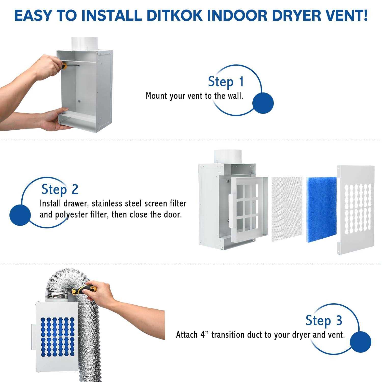 GALVANIZED STEEL INDOOR DRYER VENT KIT– Made of Galvanized Steel metal material instead of plastic and other combustible materials, DITKOK Dryer Vent is heat-resistant and high-quality. Even better, it’s powder-coated for rust resistance and lasts up to 10 years, so you’ll never have to replace your dryer vent again. Patented DITKOK 24 Gauge Galvanized Steel Dryer Vent is your better choice for indoor dryer venting.. HEALTHY INDOOR ENVIRONMENT– With stainless steel screen filter and polyester filter, DITKOK Indoor Dryer Vent can capture lint, dust, pet hair and more so as to create a healthy indoor environment for you and your family. With double filtration, the high-quality dryer vent is able to trap the finest dust particles, which makes your life healthier and better.. SAFETY– With the advantage of metal material, DITKOK metal Indoor Dryer Vent is designed for fireproof and resistant to high temperature, so that its safer to use this metal designed dryer vent in homes.. EASY TO MAINTAIN AND CLEAN– Robust design for long service life and easy maintenance. Double filter system has no water requirement, eliminating messy cleanups. Its easy to take out the filter and clean it up or replace it.. ENERGY EFFICIENT– Sustainable and long-lasting, high-quality indoor dryer vent kit, there is no need to replace Indoor Dryer Vent in ten years. The warm air released by the dryer will return to the room, it will also save energy in cold months..,,DITKOK