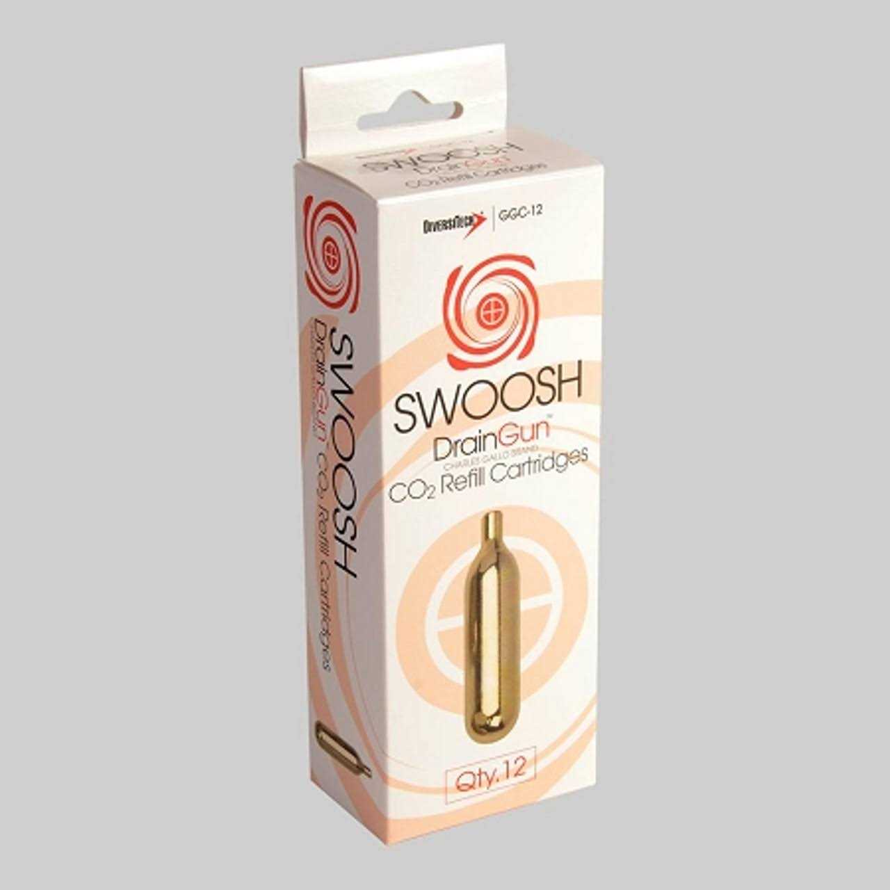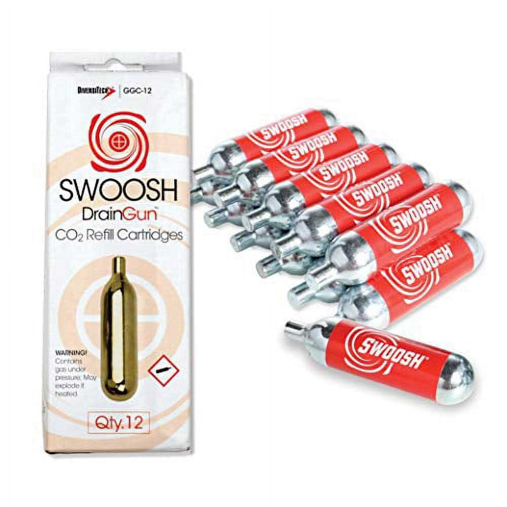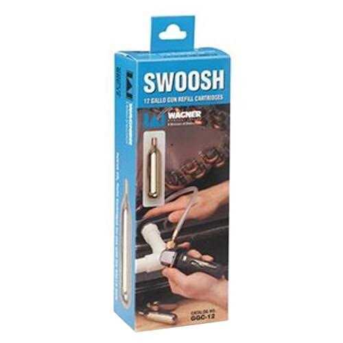 Clears condensate drains with a SWOOSH A lightweight (3 oz.) portable tool designed to blow out drain lines instantly. New larger SWOOSH CO2 cartridges now deliver 1200 PSI of oil free food grade to clear the line. Each unit comes equipped with a tapered fitting to work on 3/8in. 3/4in. drain openings. Flexible hose assembly maneuvers through cabinets coils and hard to reach drains. Gallo Gun cartridges are environmentally safe and recyclable. No need for air or nitrogen tanks. Reduces labor costs and time on service calls.