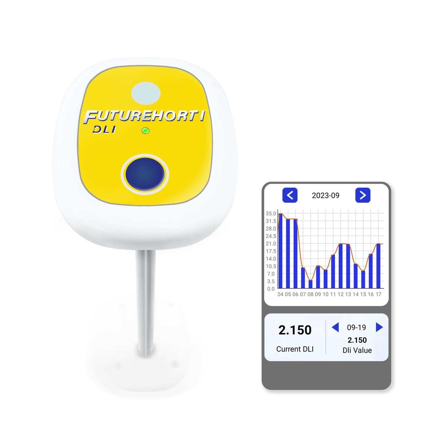 Test and record Daily Light Integral(DLI), the unit is mol/(m2d). By monitoring and adjusting the DLI, growers can ensure that plants receive an appropriate amount of light for optimal photosynthesis and growth. View the curve and data of DLI changes within 180 days. Can be exposed to rain, but not submerged in water. Long time use, use 1 AAA battery, expected to last for a year. Beautiful design, perfectly blend with your plants. Test DLI every day