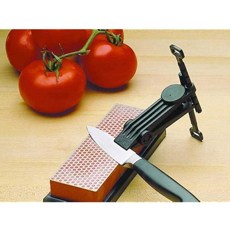 The DMT Knife Sharpening Guide can be used with any type of bench stone to provide a consistent bevel angle. Keeping a consistent bevel angle is absolutely critical if you re trying to achieve a truly sharp knife edge. To use this sharpening guide, just clamp the knife and fine-tune the bevel angle adjusters to the proper angle. Once you ve set up your angles the sharpening guide will keep your knife at the proper angle to the stone. There are seven settings on the Sharpening Guide. The angle you need will depend on the knife you are using, the height of the stone, and the setting you choose. With the seven settings you will have more than enough options to sharpen your knife at the proper angle. Made in the USA.