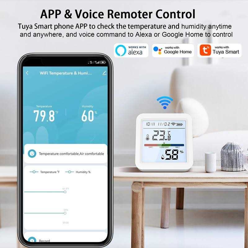 Tuya WIFI Temperature and Humidity Monitor APP Name:Tuya Smart/Smart Life With backlight Support Voice Control By Amazon – Alexa/Google Assistant Battery: DC4.5VAAA3 WIFI: 24GHz.802.11b/g/n Working humidity: 0-99.9%RH Workingtemperature:-10C-+55°C Temperature – Accuracy +0.6C (adjustable) Humidity – Accuracy:±6%RH(adjustable Temperature/Humidityreport cycle:120min(adjustable) Low-battery remind function Support Temperature/Humidity – Alarm Push Product size: 54*54*25mm Weight: 63g