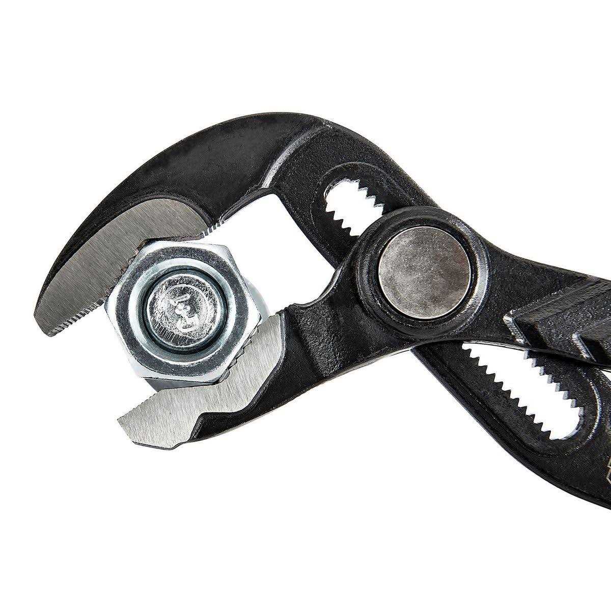 DOYLE Fast Adjust Water Pump Pliers have an easy push-button adjustment that opens instantly to one of 25 positions. The powerful V-jaw design gives you an unbeatable grip on oversize pipe, round stock and large hex fasteners. The induction hardened teeth bite into pipe, rods and shafts for a super secure grip. The self-locking mechanism allows easy one-hand operation.