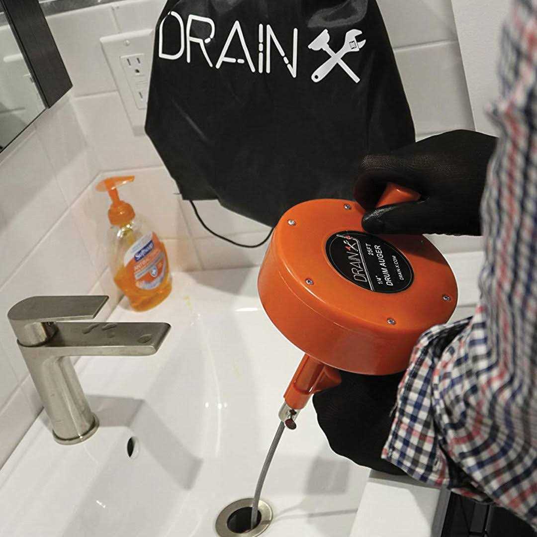 Drainx Pro Steel Drum Auger Plumbing Snake | Heavy Duty 25-ft Drain Snake Cable with Work Gloves and Storage Bag