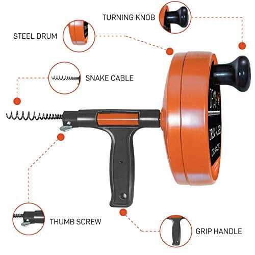 - This hand-driven drain auger will clear your househould drain clogs easily without calling a plumber.