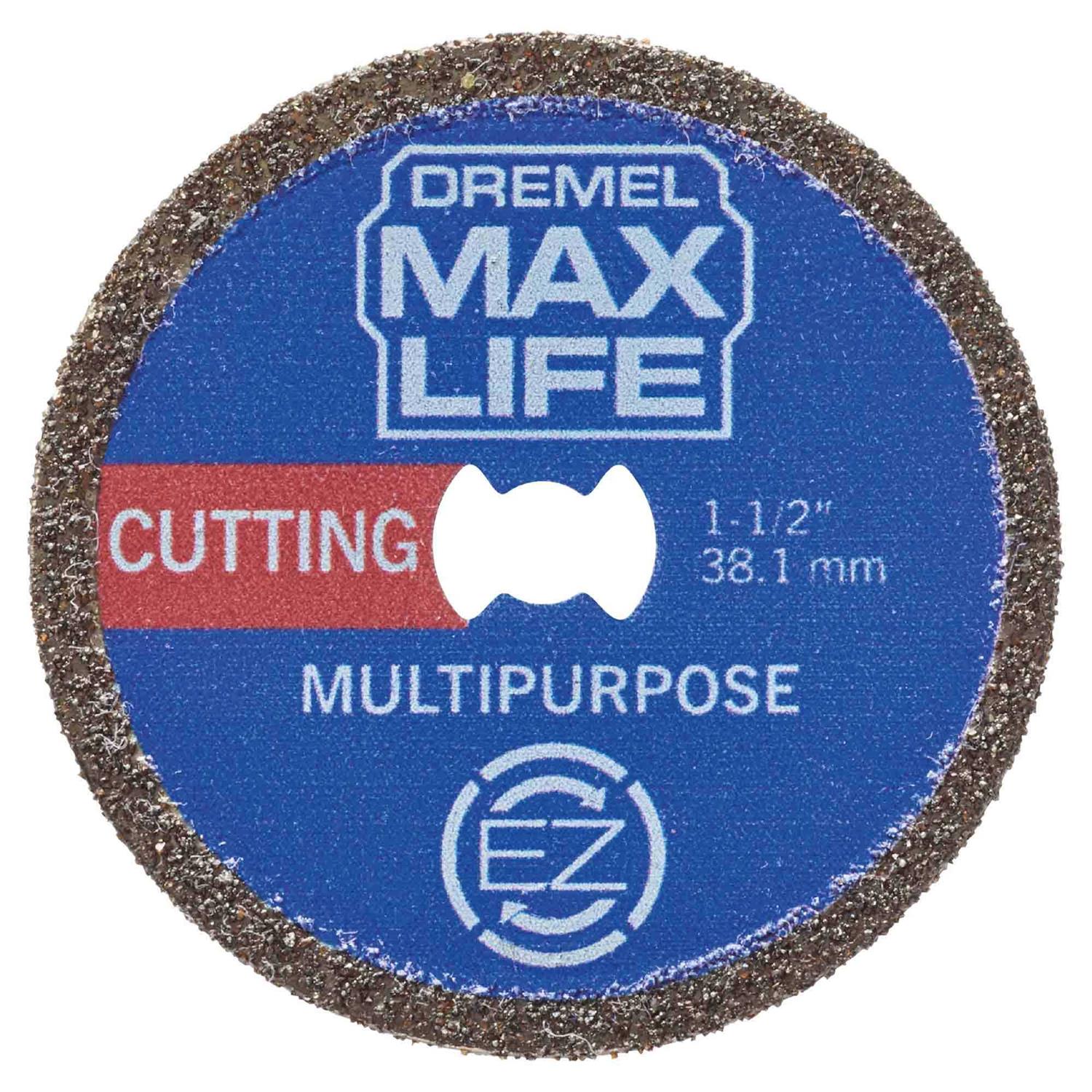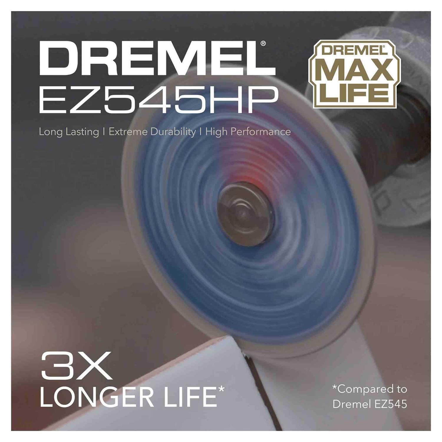 Dremel’s line of Max Life high-performance accessories provide long-lasting performance and impressive durability. Built to give you longer lasting, stronger performing, versatile accessories. The Max Life EZ545HP Diamond Wheel is engineered to last 3X longer compared to EZ545. The cutting wheel is completely coated with fine diamond particles for working with hard materials. The diamond coating adds durability and longevity, while producing smooth & precise cuts; ideal for cutting in hard and abrasive materials like marble, concrete, brick, porcelain, ceramics, hard epoxy, and soft or hardwood. The EZ545HP features 1-1/2 In. (38.1mm) diameter and is designed with the patented EZ Lock system making accessory changes 6X faster. For use with the EZ402 mandrel.