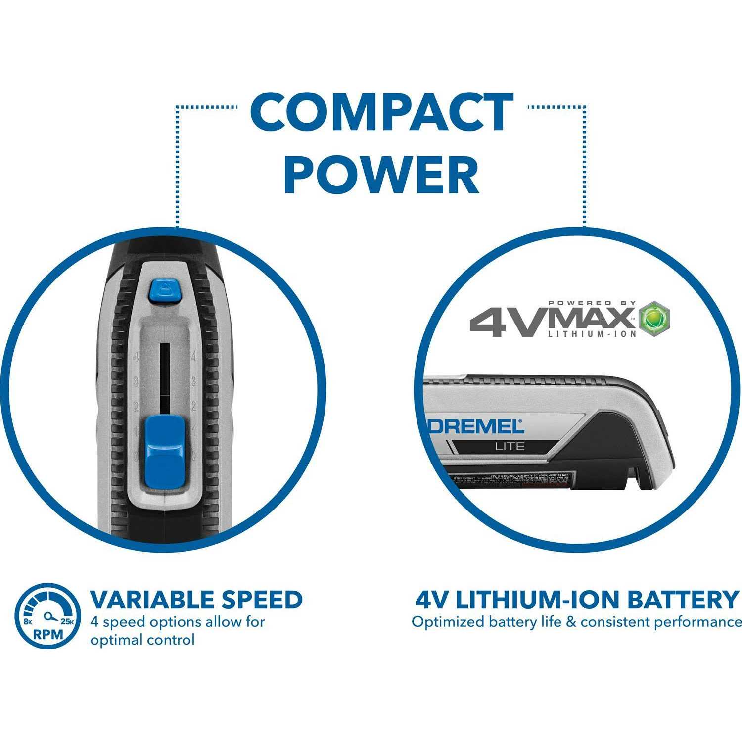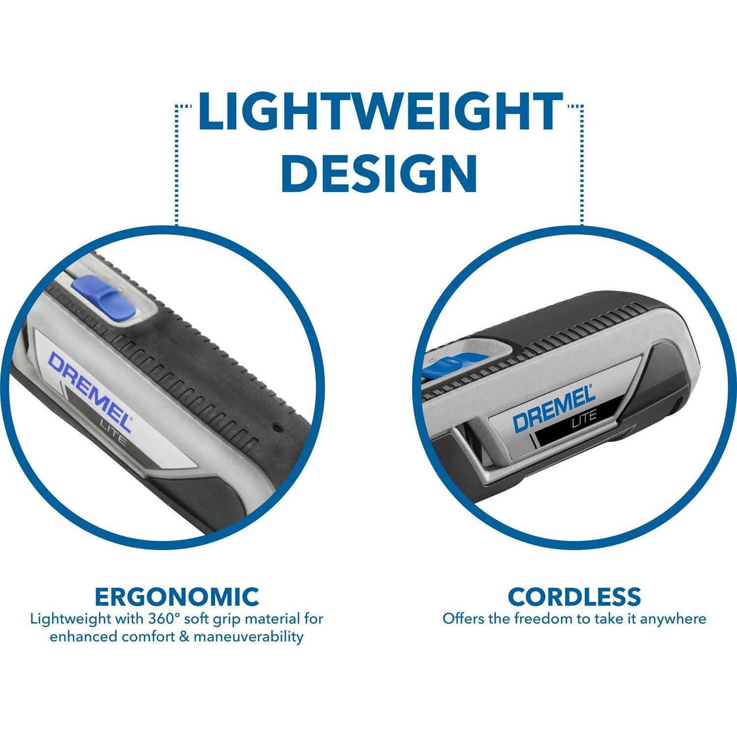 Carve, engrave, grind, sharpen, clean, polish and sand with a single rotary tool. Designed for beginners in mind, the Dremel Lite is a user-friendly solution for a wide range of projects. Whether you are completing the light finishing touches, needing to fit into a tight spot, or completing the most precise tasks– the versatility of the Dremel Lite allows you to respond to projects quicker. The cordless rotary tool features 8,000-25,000 RPM of rechargeable battery powered by an efficient USB system that holds its charge. The four different speed settings offer better control for different applications, plus the lightweight design and soft grip make it easy and comfortable to use. The Lite is compatible with Dremel’s entire line of rotary accessories, making it a must-have for busy homeowners, crafters, and new DIYers.