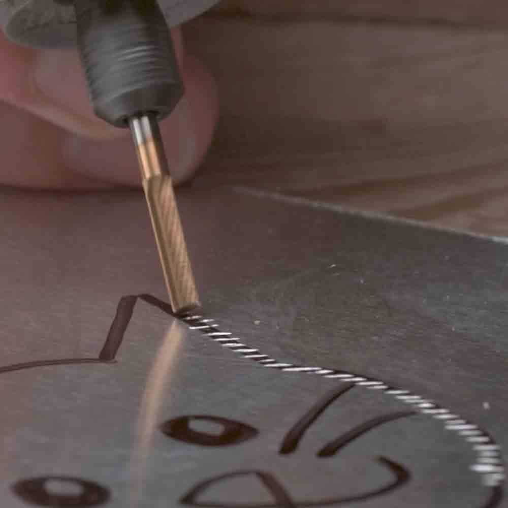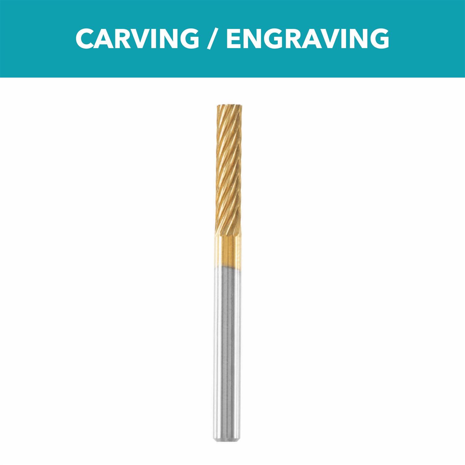 • The cylinder shape of the carving bit allows for deep removal of material, cuts flat areas, round edges and makes stop cuts and v-cuts