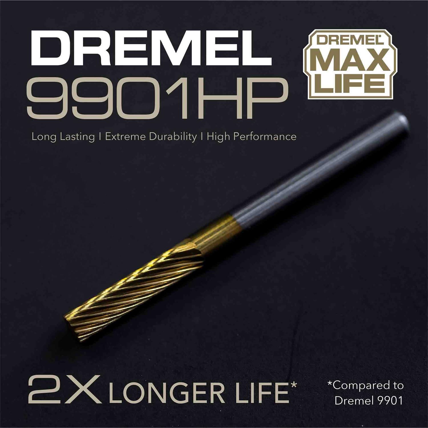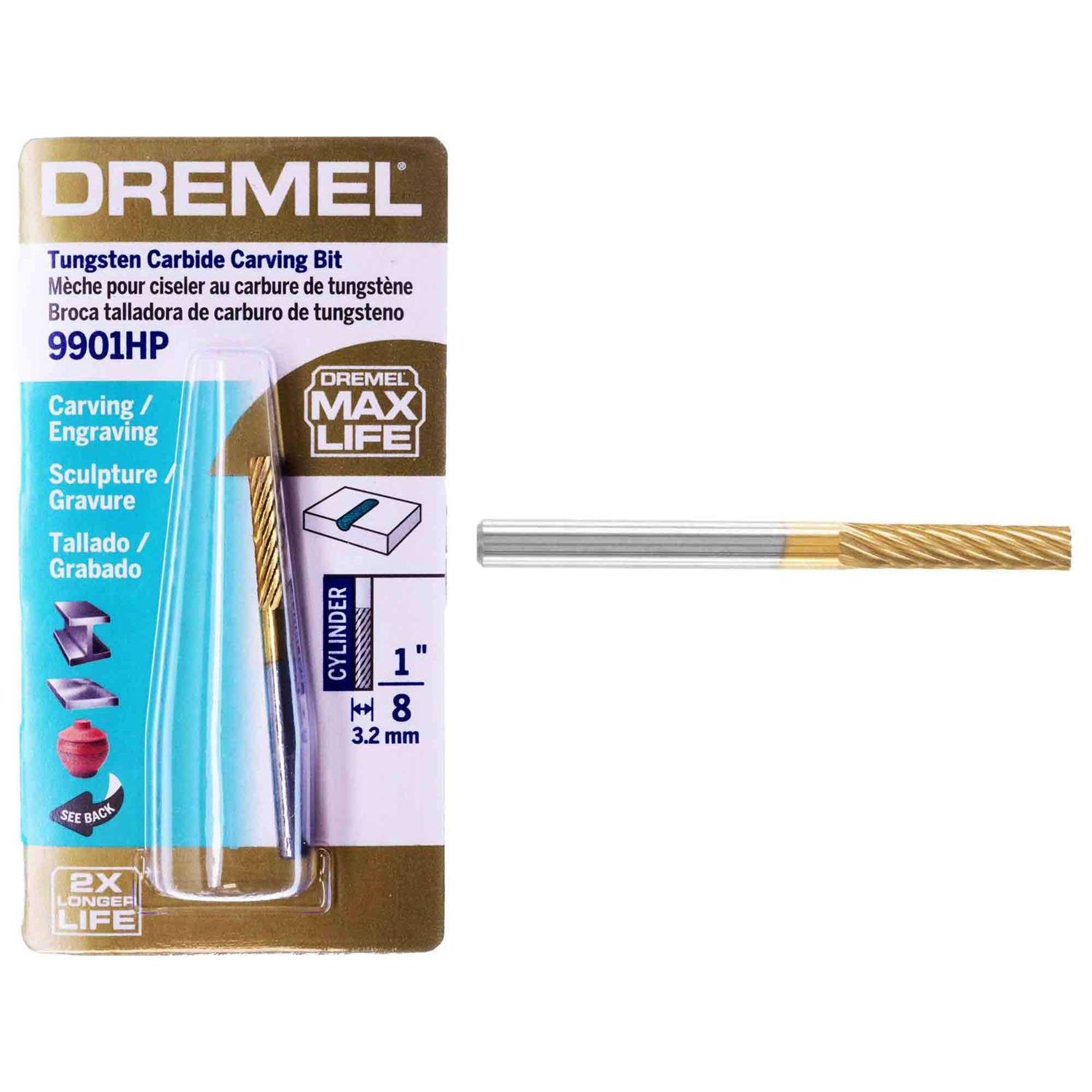 Dremel’s line of Max Life high-performance accessories provide long-lasting performance and impressive durability. Built to give you longer lasting stronger performing versatile accessories. The Max Life 9901HP Tungsten Carbide Carving Bit is coated in titanium nitride and is engineered to last 2X longer than the standard non-coated Dremel 9901 bit. For use with all Dremel high-speed rotary tools the 1/8 In. (3.2 mm) accessory can be used for more aggressive applications to shape smooth or grind hard materials such as metals hardened steel fire ceramics cast iron plastics and hardwoods.