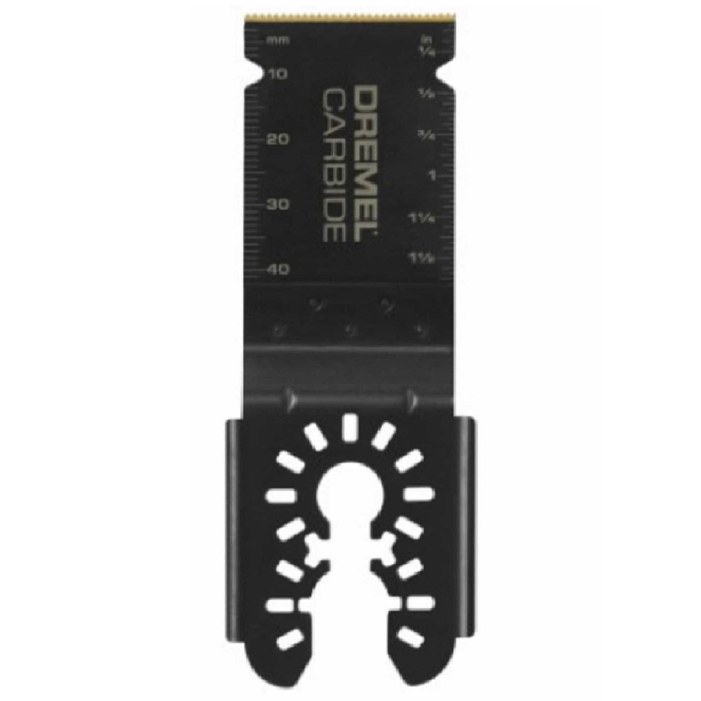 Dremel universal oscillating accessories are the first truly universal oscillating accessories available that require no adapter. The unique dual interface fits all competitive Oscillating Tool, including those with a quick change feature. The Dremel MM485U universal carbide flush cut blade has high-performance carbide teeth designed to cut hard and abrasive materials like nails, screws, stainless steel bolts, galvanized pipe, plaster & lathe, cement board, fiber board, sheet metal, slate, ceramic tile and more! Its wide 1-1/4 In. blade speeds through long cuts and can make plunge cuts up to 1-11/16 In. deep.