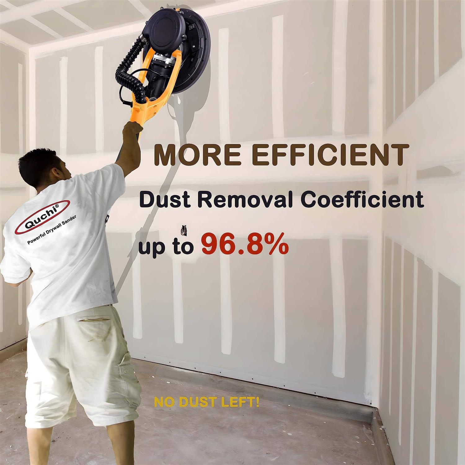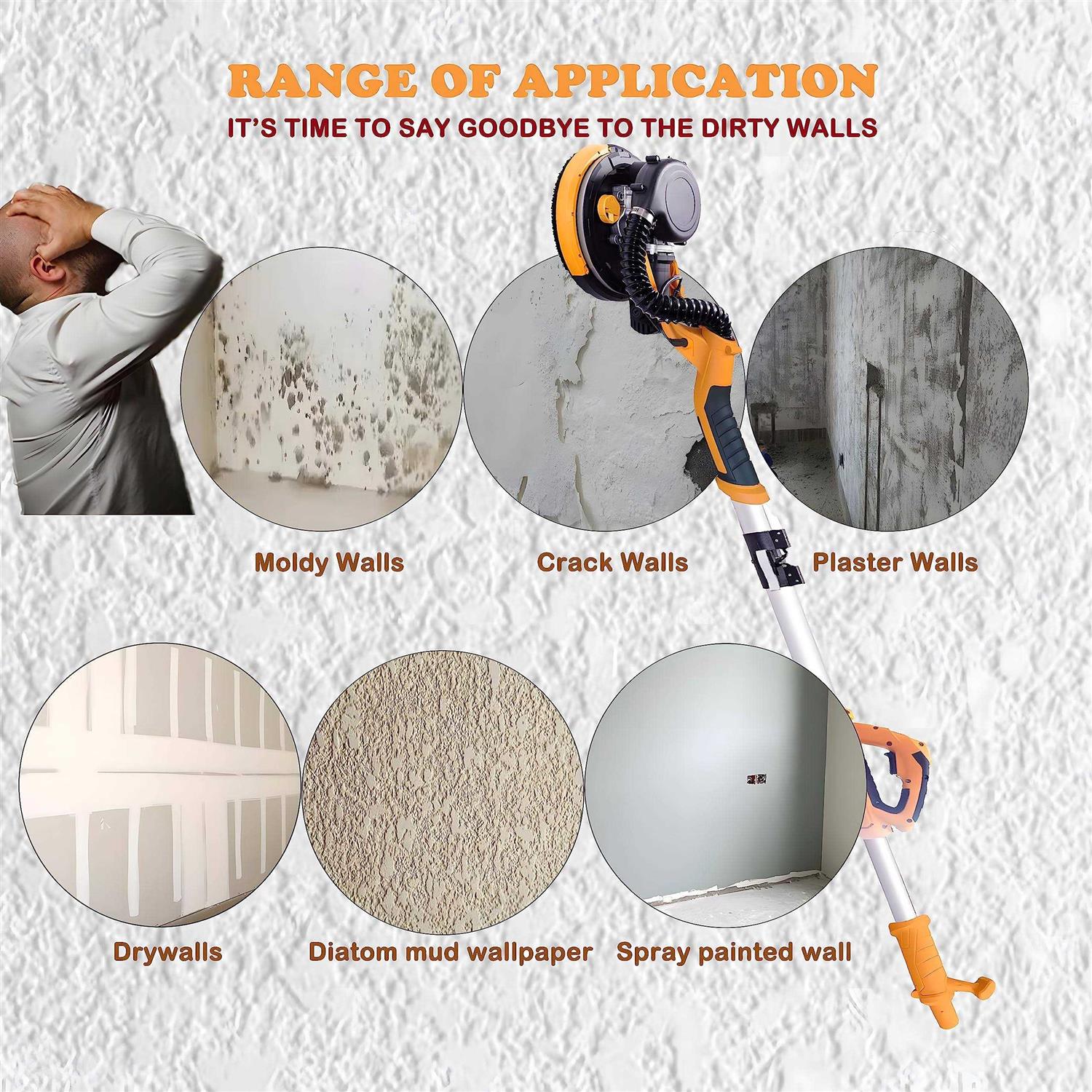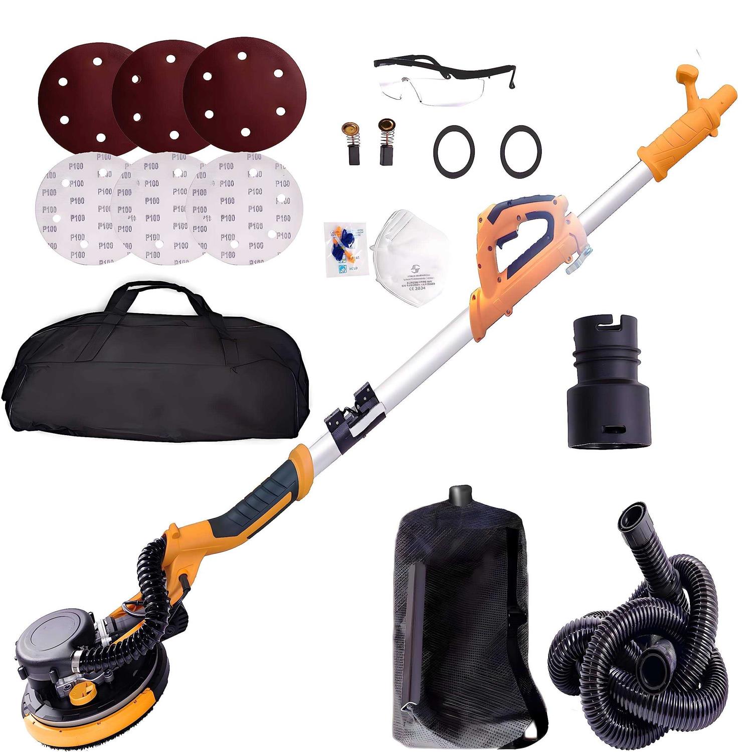 Ergonomic Design:Foldabe handle reduce the storage space and easy for take away. 360 degree swivel head suit for conner, edge.Dia 8.8inch big sander pad is more efficient than others. Aluminium alloy handle reduce the fatigue. Powerful Power with Brass Motor: The equipment with 750W powerful brass motor which handle all kind of surfaces quickly and comfortably. 7 speed adjust system offered 800-1750RPM. 6 Amps. Practical Configuration:Take many factors into consideration, the facility include the LED light for the dark area working, lengthen the wire to 26ft for the large sized area, and a portable storage bag. Wide Applicability: The equip comes with 12pcs papersanders which attach the pad easily. It applies to many surface such as drywall, ceiling, paited wall and floor ect. The 360° drywall sander with vacuum, designed to make sanding and cleaning easier and more efficient! This innovative tool is perfect for both professionals and DIY enthusiasts who are looking to improve their drywall finishing.