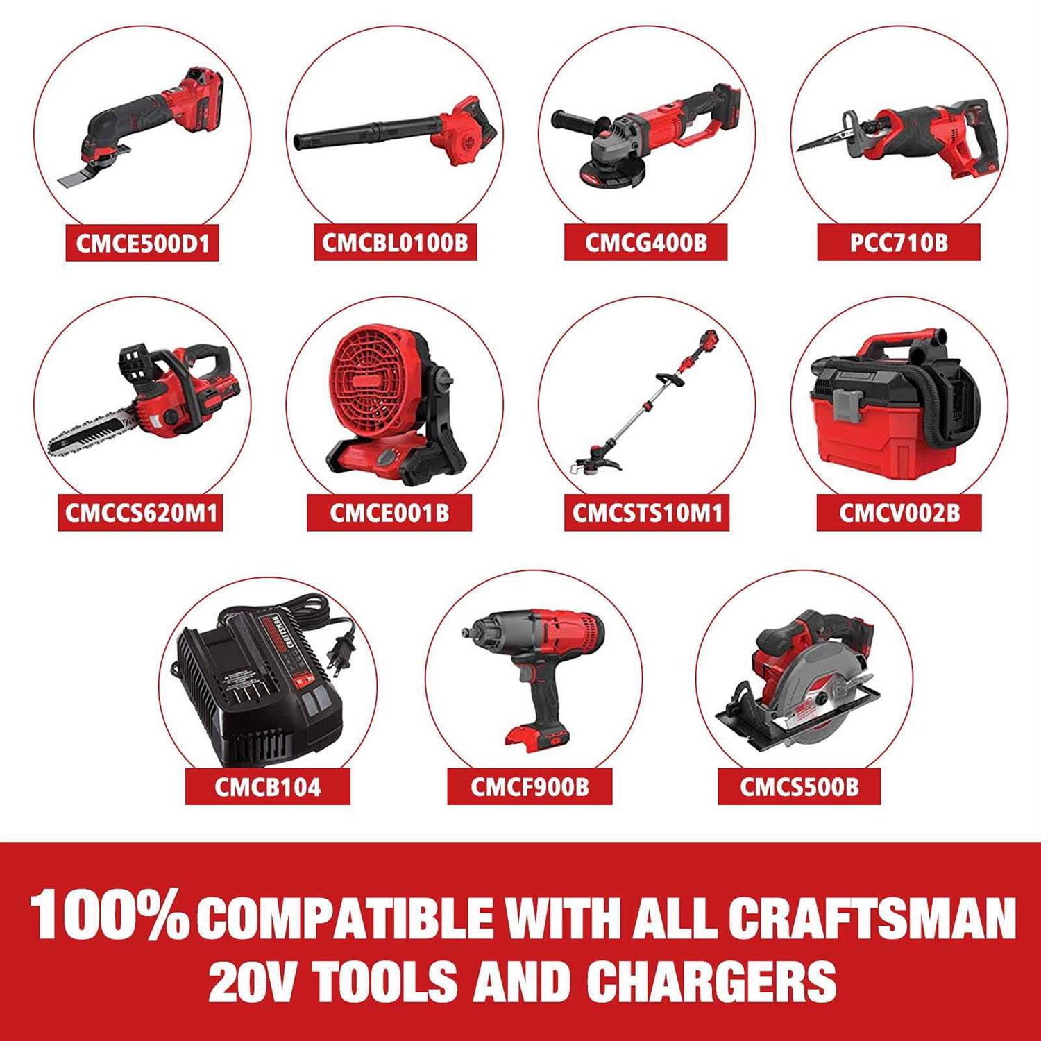 (Note: CANNOT fit the Craftsman 20V tools over 400W and Craftsman 20V max Bolt-On & DieHard series) 【Why Choose Us?】 2Pack DSANKE CMCB204 20V 3000mAh MAX Lithium Ion Battery Replacement for Craftsman V20 CMCB202 CMCB204 CMCB201 CRAFTSMAN V20 Battery /b br br DSANKE for Craftsman V20 Lithium Battery CMCB204 Description: /b br Battery capacity: 3000mAh br Battery voltage: 20V br Battery type: high quality lithium battery br Color: Red & Black br br Compatible with Battery: (ONLY for craftsman 20V max V20 series, CANNOT fit the craftsman 20V max Bolt-On series.) /b br for Craftsman V20 20V MAX Lithium Ion Battery CMCB204, CMCB202, CMCB201 br for Craftsman V20 20V MAX Lithium Battery Fast Charger CMCB104 br for Craftsman V20 20V MAX Cordless Power Tool: br V20 Cordless Chainsaw CMCCS620M1 br V20 Cordless Impact Wrench CMCF900B br V20 Impact Wrench Cordless Kit CMCF900M1 br V20 Cordless Lopper CMCCSL621D1 br V20 Pole Saw CMCCSP20M1 br V20 Handheld Blower CMCBL720D2 br V20 Cordless Drill/Driver Combo Kit CMCK700D2, CMCD710C1, br CMCD711C2, CMCD710C2, CMCD701C2, CMCD700C1, CMCK401D2, CMCK210C2, CMCK200C2 br V20 Cordless Circular Saw CMCS500B, CMCF810C1, CMCF800C2 br V20 Cordless String/Hedge Trimmer CMCST920D2, CMCST900D1, CMCST910M1, CMCHTS820D1 br V20 Cordless Power Tool: CMCS600B, CMCV002B, CMCS500B, br CMCW220B, CMCE500B, CMCS300B, CMCE500D1, CMCN616C1 br br Battery maintenance: /b br 1. The battery should be stored in a cool, dry and safe environment. Avoid placing the battery near heat sources, open flames, flammable and explosive gases, and liquids. br 2. If you do not plan to use the battery for a month or more, be sure to remove the battery pack. The storage time needs to be recharged at least 1-2 hours per month, it is recommended to charge it to 40% -60% br 3. Lithium-ion batteries discharge themselves during storage; remember to charge the batteries before use. br Package Includes: /b p/ 2*DSANKE 20V 3000mAh MAX replacement Lithium Ion Battery CMCB204 for Craftsman V20 Cordless Power Tools br / 1* User Manual /p