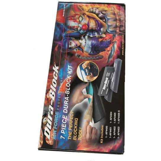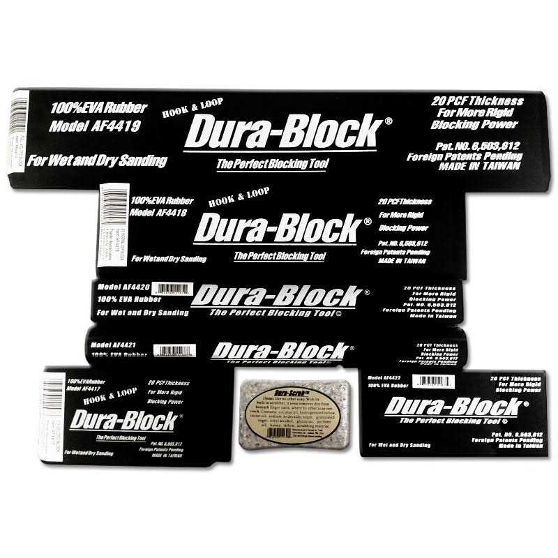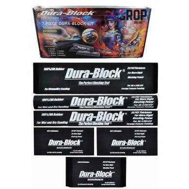 Features and Benefits: Dura-Block conforms to the panel curve Will not dig into fill material Hook and Loop allows use of money saving Hook and Loop Paper Known worldwide as the gold standard in blocks Product is machined to a perfect, flat finish This 7 piece Dura-Block Kit contains the most popular Dura-Blocks in money saving Hook and Loop attachment. This allows reuse of paper when changing grits. The patented materials used in Dura-Blocks allow them to conform to the panel curve yet the surface hardness prevents digging into fill materials. Simply the best blocks available.