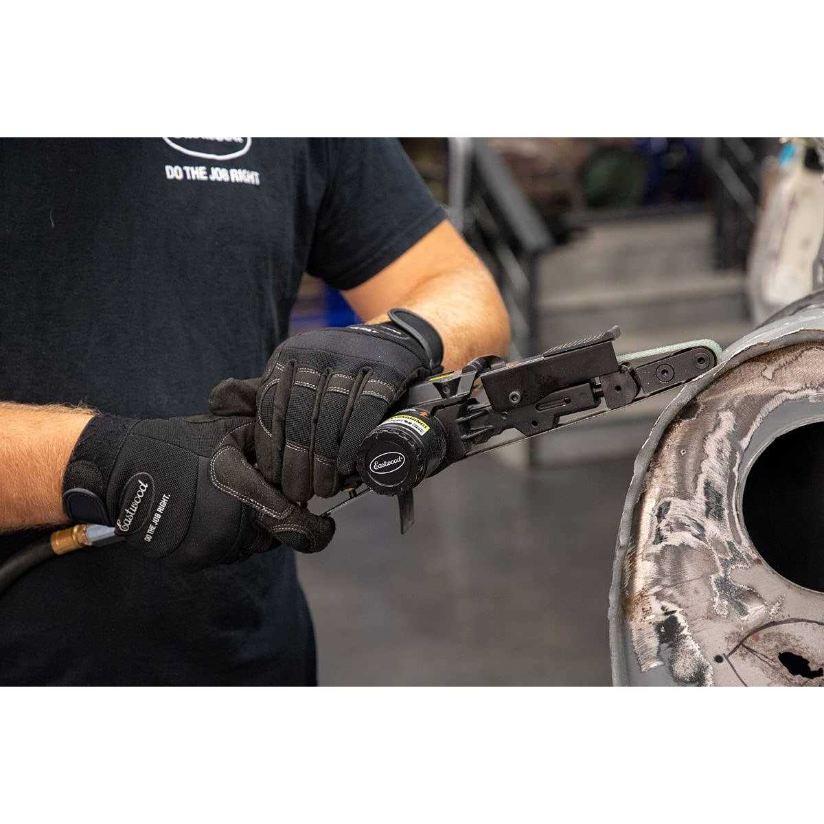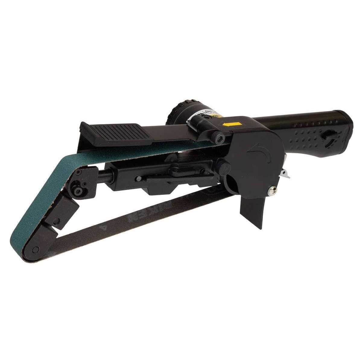 The Eastwood Pro Mini Angle Belt Sander Features: 3/4″ x 20.5″ Paper size for excellent paint removal, smoothing, and rust removal in limited space applications; Great for surface conditioning of tubes and rounded surfaces; Air outlet located in the back of the handle to direct exhaust air away from your work area; Quick change sanding belt replacement makes for high tool up time; Adjustable sanding arm provides increased versatility in low clearance situations;EASTWOOD PRO MINI ANGLE BELT SANDER 3/4″ X 20-1/2″ The Eastwood 3/4″ X 20-1/2″ Pro Mini Angle Belt Sander is compact and powerful with an adjustable angle and articulated sanding arm for ease in grinding and sanding in the most difficult to access areas. It features a sealed ball bearing drive assembly for smooth, low vibration operation and long life. The precision diecast housing provides a solid foundation and offers ergonomic, one handed operation controlled by a convenient handle mounted paddle trigger.
