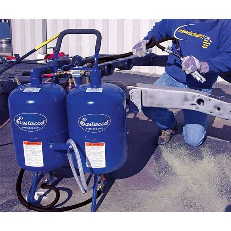 Eastwood Master Blaster Dual Soda and Abrasive Blaster lets you switch on-the-fly between soda and abrasive media or a combination of both! Use soda blast supplies to remove coatings on delicate substrates such as fiberglass, chrome or stainless then easily switch on-the-fly to harsher abrasives such as crushed glass, glass bead or aluminum oxide to blast through heavy scale, rust or multiple coatings. It’s a must-have tool for restoration and maintenance shops where rust and paint removal are issues on multiple surfaces such as fiberglass, steel, aluminum, etc. Each of the fully welded, powder-coated tanks holds 100 lbs. of abrasive media (75 lbs. of soda), and works on as little as 10 cfm at 90 psi. 8-ft.-long, heavy-wall blast hose. Use with 80 grit or finer blast media. Use of Walnut shell media is not recommended. Specifications Tank Volume (2X): 10 gallons / 100 lbs. abrasive or 75 lbs. of soda media Hose Length: 8 ft. x 1/2 inch i.d. Working Pressure: 60-125 psi Air Consumption: 6-25 cfm Weight: 80lbs. Contents (1) Dual Tank Assembly (pre-assembled with: Lower Frame and Axle Assembly; Inlet Manifold Assembly) (1) Upper Loop Frame (2) Wheels (1) Front Support Loop (1) Blast Discharge Nozzle (Dead Man Valve)(w/ 3.5mm Nozzle, #12113, installed) (1) 2mm Nozzle (1) 2.5mm Nozzle (1) 3.0mm Nozzle (1) Deadman Valve Sealing Pad (1) Blast Hose Assembly with 2-1 Manifold (1) Moisture Trap / Inlet Valve (1) Pressure Gauge (1) Face Shield (1) Funnel (1) Tefl on Tape (4) Washers (4) Cotter Pins (4) 1/2 inch Long Socket Head Cap Screws (1) Hex Wrench