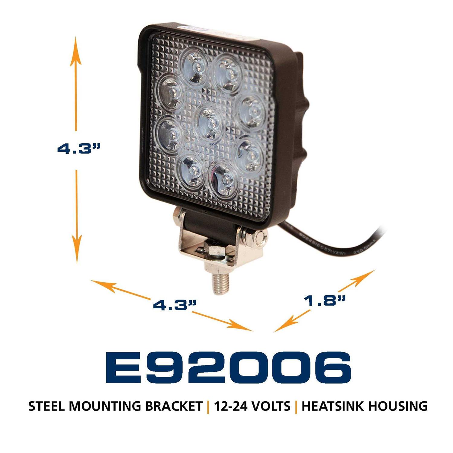 The E92006 work light offers the latest technology and the very brightest white light for your application. This LED model offers over 80,000-hours of maintenance free life expectancy coupled with extremely low amp draw. Upgraded aluminum heatsink housing and stainless steel bracketry set this work light apart for other models.