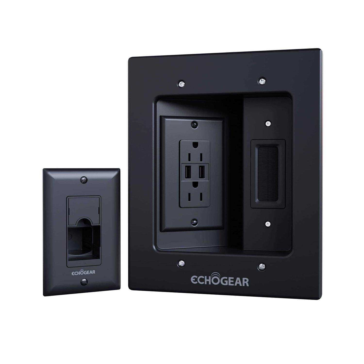 Power your devices and hide all the cables behind the wall. Includes 2 standard AC plugs, 2 USB-A ports, and low voltage pass through. Comes with everything you need for a quick & clean install, no wiring required. Show your wall who’s boss with the included wall template & drywall saw. Do you have weird plugs? Don’t feel bad. The dual top outlet has plenty of space to fit awkwardly shaped power plugs. Power your TV, streaming device, and LED lights all in one location. Use the brush plate pass-through to hide your HDMI, ethernet, and audio cables. Unique cable catching design means your wall won’t eat your cables, although they do look delicious. Includes a 6ft extension cord with a low profile plug to power the whole kit. Using an outlet further away? Any normal 3-prong extension cord will work. Our ECHOGEAR Pros are here to help 7 days a week. So you finally got your TV on the wall and dangling cables are driving you nuts. Been there. Use this all in one cable management kit to hide your TV wires for good. Powers 2 devices with room for 3 low voltage cables (HDMI, audio, etc). Get those cords out of the way and get back to lounging on the couch with your squad. A Shagadelic Cable Management Kit Some cable management kits leave you hanging out to dry like yesterday’s laundry. They don’t come with a cutting template or saw. Some even require you to do the wiring. Yikes. One false move and you’ll catch a jolt that’ll leave your hair looking like Doc Brown. Most install manuals are more confusing than the movie Raising Arizona. You’ll be able to set up this in-wall cable management kit in under 30 minutes. A half-hour in exchange for a lifetime of kickin’ it cable-free? What more could you ask for? So… How Do you Install It? The first thing to do is decide where you want the in-wall boxes to be. There can be up to 6′ between the top and bottom boxes. If you’re using the included extension cord, make sure you’re less than 6′ from an outlet. Can’t get that close? Any 3-prong extension cord will work, so raid your Christmas decoration box for a spare cable. Now slap the template on the wall so you’ll know exactly where to cut & won’t jack up the wall. Here’s the fun part, grab the drywall saw and get after it. For safety, I like to test saw blade sharpness by using it to open up a bag of America’s #1 finger hat, Bugles. Now that you’re 3/4 of the way into those Bugles, use the template to cut perfectly shaped holes in the wall. Next, you’ll run all the cables through the wall connecting them from the top to the bottom box. Finally, connect the wall plates to the wall with a screwdriver & bam, you’re done. CMIWP2