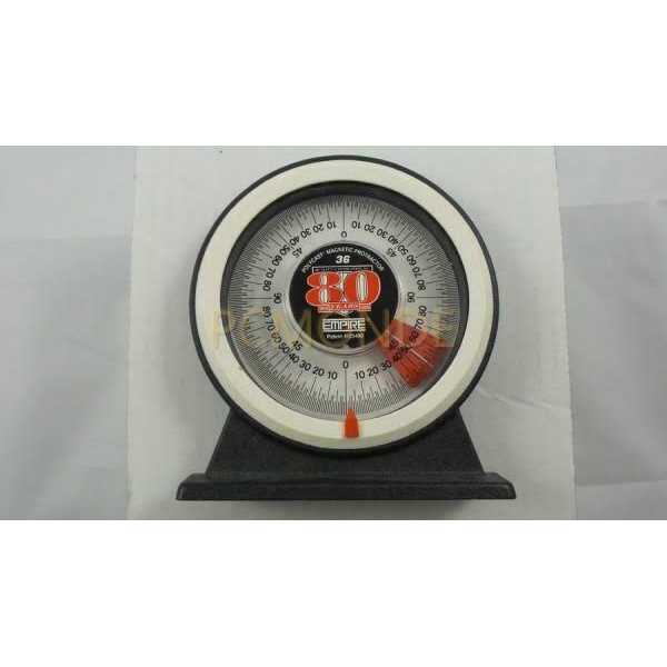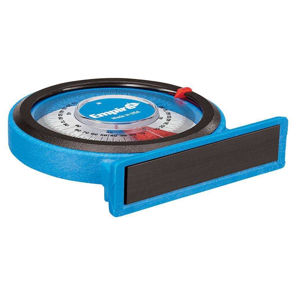 Use the Empire Polycast Angle Meter Plastic Magnetic Protractor to help accomplish your projects. Its special Angle in! dial is easy to read and lets you determine pitch and slope at just a glance. The adjustable angle pointer makes it easy to use, while the angle-pitch chart streamlines calculations. This 0-90 degrees angle finder protractor is made with a tough polycast acrylic lens as well as a magnetic base and back.