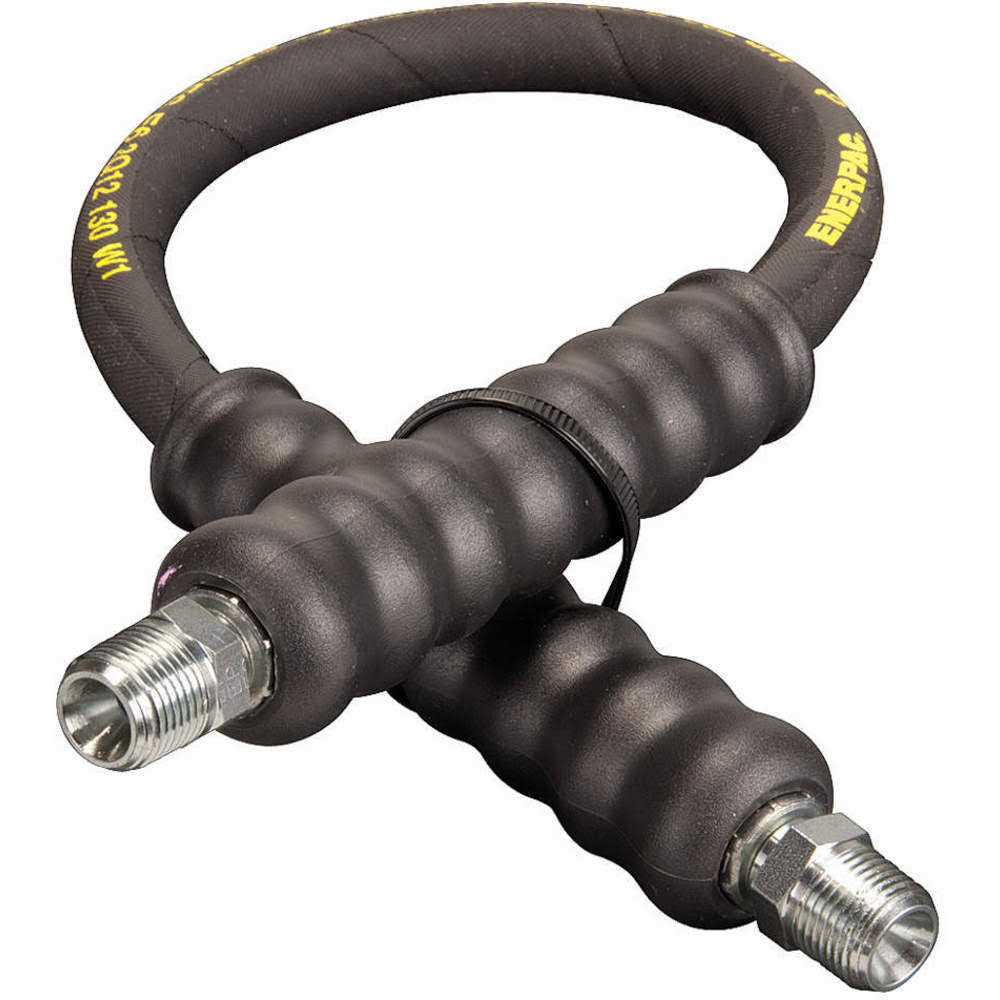 Enerpac H900 hydraulic hose assemblies are better suited for long runs than Enerpac H700 hydraulic hose assemblies. They come with NPTF (National Pipe Taper Fuel) fittings installed on the ends of the hoses and are ready to connect to equipment. They are used for transferring petroleum- and water-based fluids in hydraulic systems. These hoses have crimped-on rubber strain relief on the ends of the hose that helps extend its life. The hoses’ tube is made from rubber, which is more flexible and has less bend memory than thermoplastic. They are reinforced with two layers of steel wire braids. Hydraulic hose assemblies come with fittings installed on both ends for connecting the hoses to compatible equipment. Hydraulic hoses are used for transferring fluids in petroleum- and water-based hydraulic systems commonly found on industrial, mining, and manufacturing equipment. These hoses are reinforced to maximize their strength. This listing is for each. Technical Specification Item Hydraulic Hose Assembly Hose Inside Dia. 1/4 in Hose Length 6 ft Hose Tube Material Rubber Hose Cover Material Polyurethane Hose Reinforcement Type Braid Hose Reinforcement Material Carbon Steel Hose Color Black Series H900 Max.