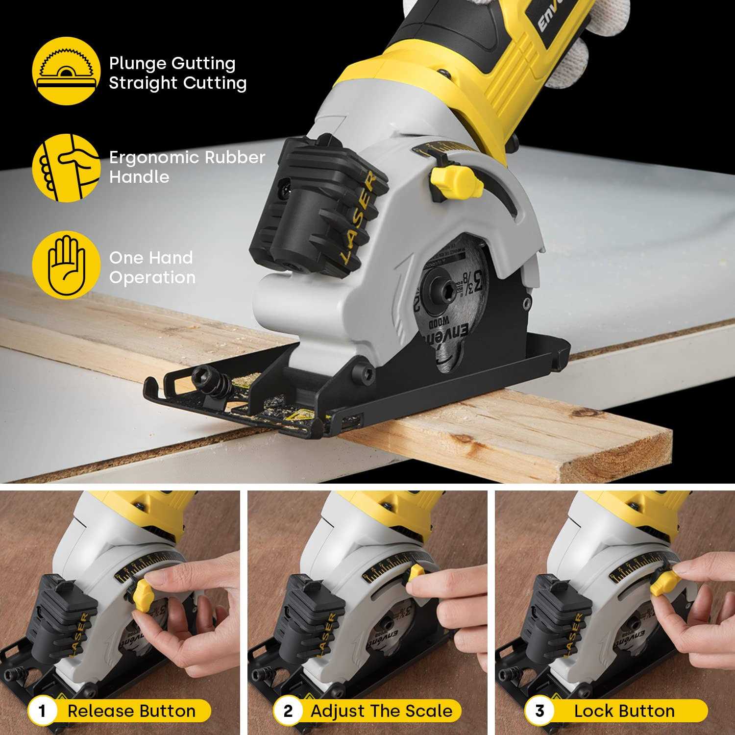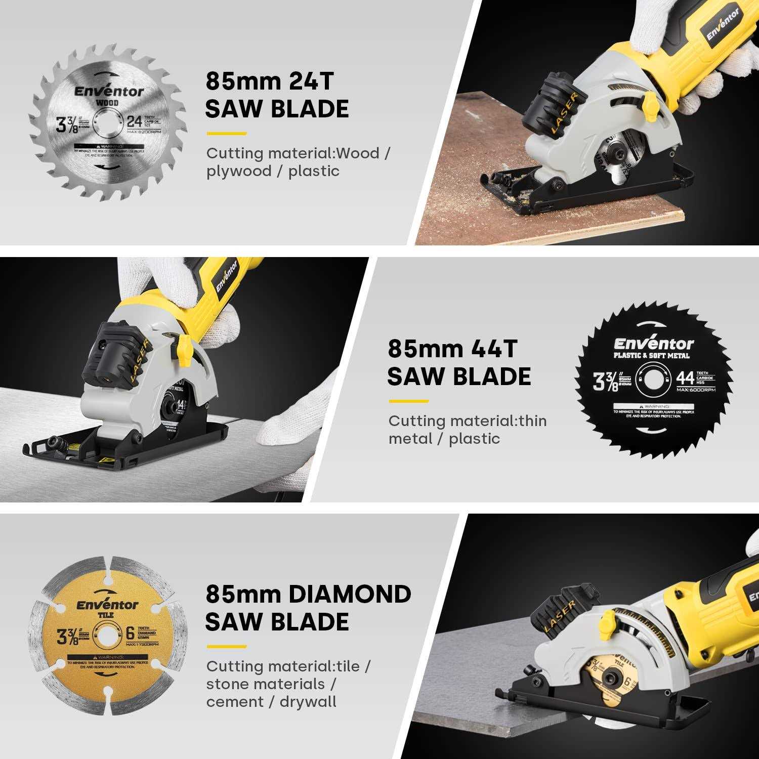 【POWERFUL MOTOR AND COMPACT SAW】580W/4.8Amp powerful motor provides 4000RPM no-load speed for cutting wood, metal, tile, aluminum plastics, and PVC tubes with ease. 3 Blades: 1x24T TCT(85mm) for woodcuts, 1x44T HSS(85mm) for wood and soft-metal cuts, and 1 grit diamond blade(85mm) for tile cuts, extending the applications of the compact circular saw. Great circular saw for home improvement and the perfect gift for woodworking and DIY lovers. 【CUTTING DEPTH】ENVENTOR mini circular saw cutting depths of up to 1-1/16″”, The left-sided blade design gives you a clear sight of the cutting line. A parallel guide attachment ensures straight, precise cuts easily and quickly. 【PRECISE LASER GUIDE and SAFE DESIGN】Legible laser guide can assist you to cut a precise straight line. Greatly improve your work efficiency. The gauge iron wraparound base and aluminum upper cover for improved safety. The double safety button offers double protection, in case of any accidental start-up. Grip with integrated safety trigger for safer control. 【ERGONOMIC & SAFETY DESIGN】Compared to conventional compact circular saw, its lightweight and compact design makes it portable to carry both indoors and outdoors. The double protection switch prevents the machine from accidentally opening and promises a safer cutting job. The optimized ergonomic slim grip provides ease and less fatigue to one-handed operation. A thumb-activated Safety Trigger-Release Button prevents accidental trigger activation. 【Package Contents】1* 4.8A Mini Circular Saw, 3Blades(1*85mm 24T Carbide Blade, 1*85mm 44T HSS Blade, 1*85mm Diamond Blades, 1*Wrench, 1*Rip Guide, 1*Vaccum Adapter, 1*User Manual. 1* 4.8A Mini Circular Saw, 3Blades(1*85mm 24T Carbide Blade, 1*85mm 44T HSS Blade, 1*85mm Diamond Blades, 1*Wrench, 1*Rip Guide, 1*Vaccum Adapter, 1*User Manual”