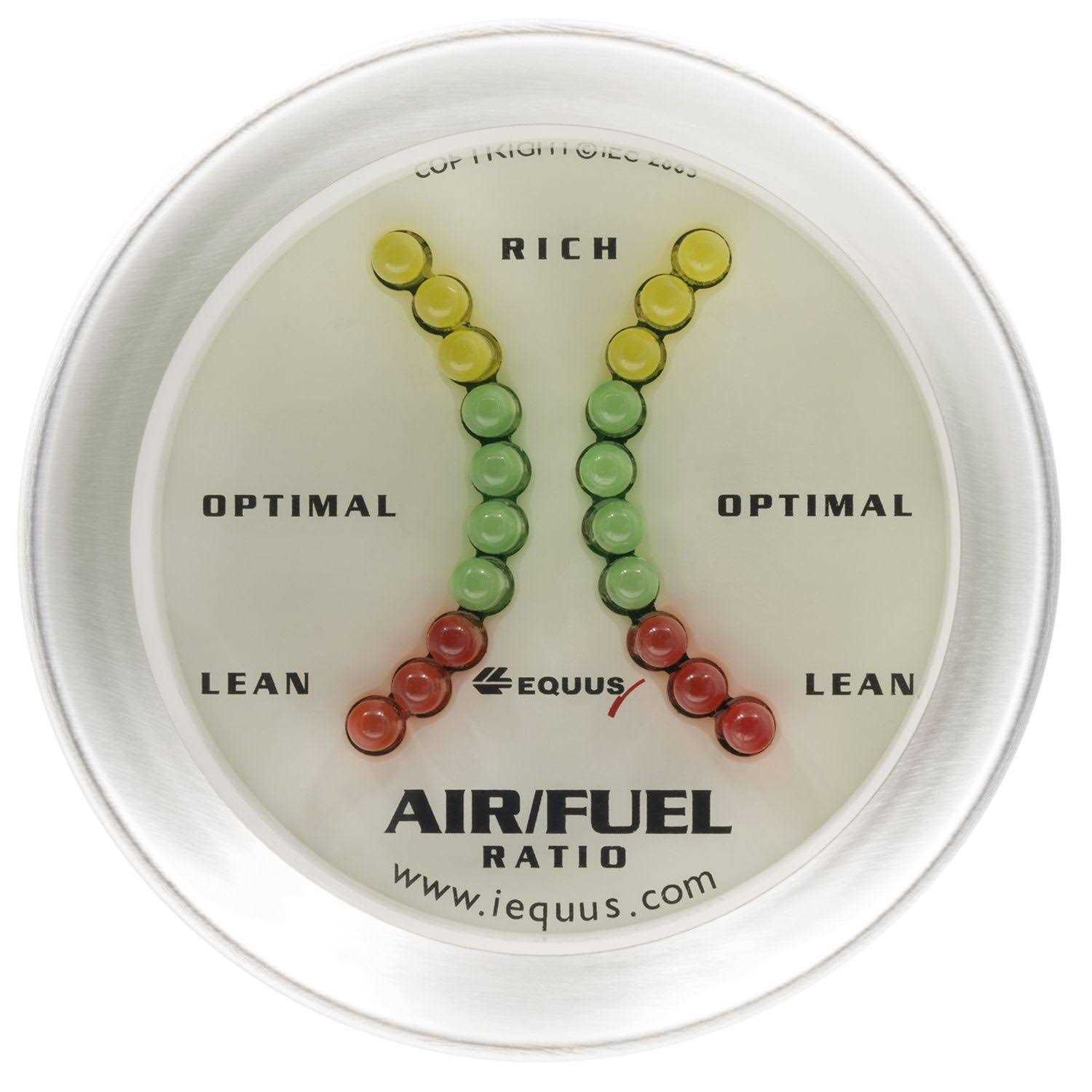 This accurate, durable, and simple to install iEquus 8000 Performance 2 in. electrical air/fuel ratio gauge features race inspired styling, 20 multi-color LED radial display LEDs for enhanced visibility, white dial, satin silver aluminum bezel, and dual readouts for affordably and efficiently monitoring the air to fuel mixture ratios of your engine. Installation hardware included. Compatible with most existing vehicle OEM narrowband 0-1 V oxygen (O2) sensors (not included). Connect to pre-existing or separately purchased 0-1 volt narrowband style oxygen sensor(s) and determine whether the engine is running rich or lean for maximum performance efficiency. Dual display offers independent or dual left/right bank vs. inline readings Color LEDs provide a quick visual display of air/fuel ratio to allow you to quickly dial in your combination. Aluminum bezel is lightweight and optimizes appearance Useful for tuning carbureted and fuel injected engines Features 1/4 in. male spade terminals for electrical connections. Wiring not included. Includes installation instructions in English, French, and Spanish.