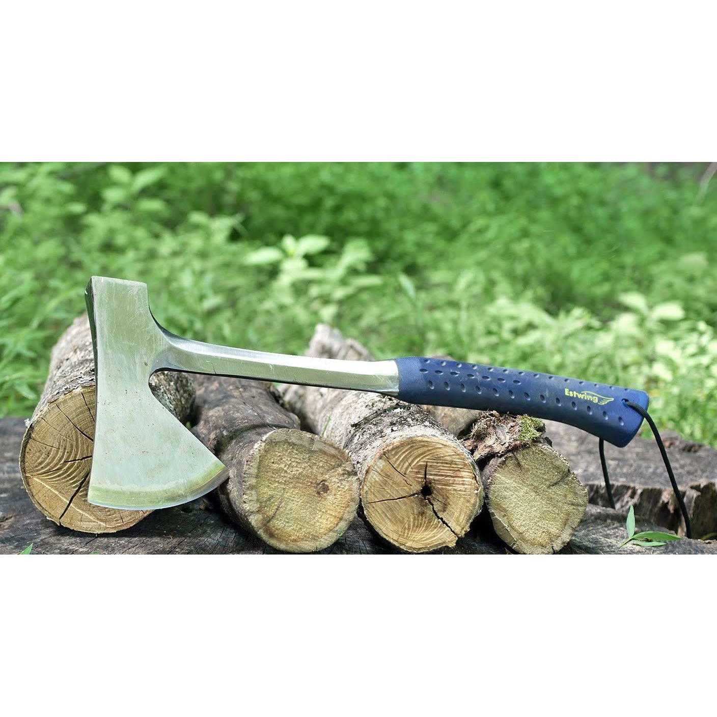Made in the USA this Estwing E45A 26 inch camper axe is the ideal axe for camping, hunting and farm use. It has a forged steel head with has a bonded and molded Shock Reduction Grip that reduces shock up to 70 percent and will not come off. The 4″ cutting edge makes deeper faster cuts and easier chopping. Includes a nylon sheath. Ideal camping axe that is lightweight but tough for cutting and chopping small to medium size wood and branches for fire wood.”