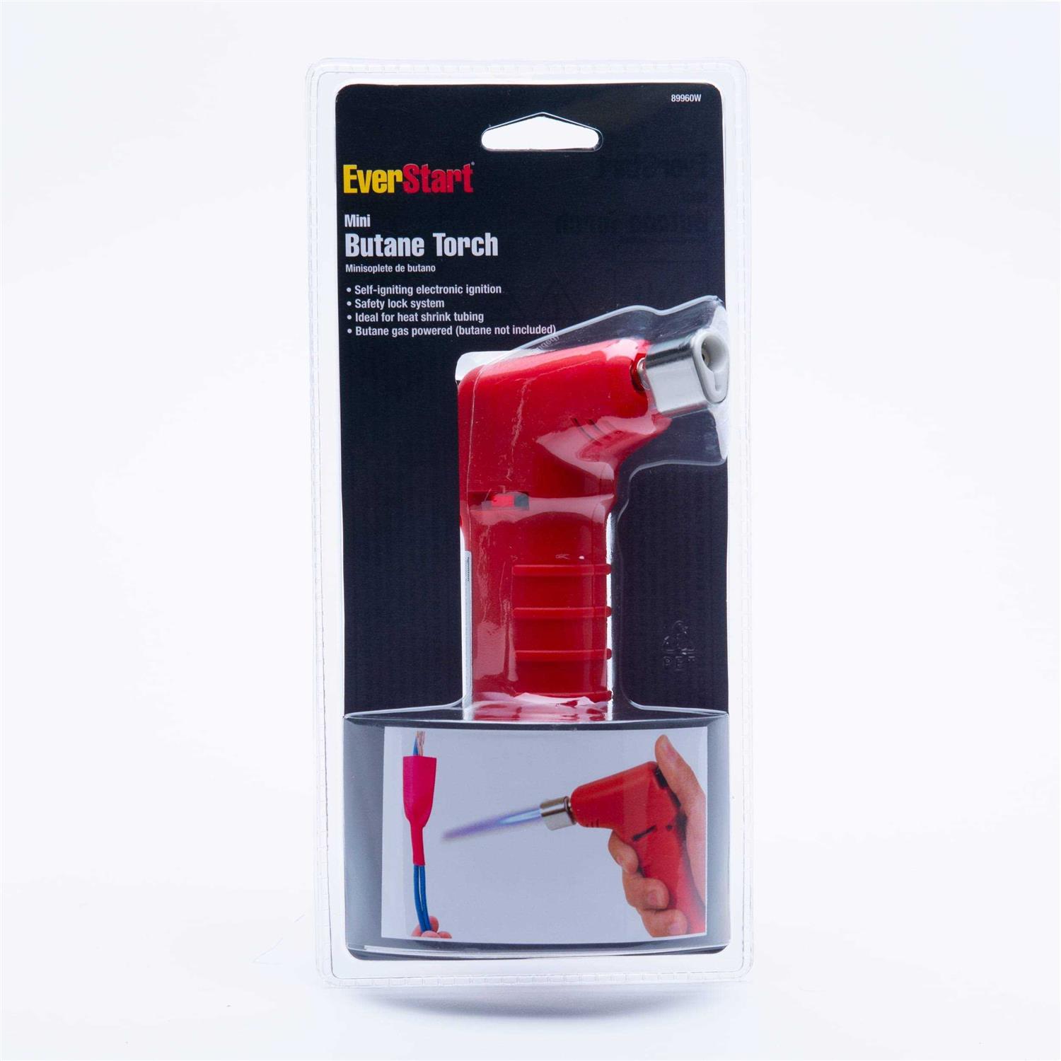 The EverStart Mini Butane Torch is a convenient, handheld tool that can be used for a variety of home needs. Use it for quick repairs, to weatherproof terminals, or for heat shrink tubing. The soldering torch can also be used to weld together metal with a press of a button. Its small size makes it easy to operate it with one hand and aim at more precise locations. Or use the handheld butane torch in your kitchen, for example if you want to quickly caramelize sugar when making creme brulee. This tool features a self-igniting electronic ignition for immediate usage and comes with a with safety lock system. Fill it with your own butane for operation and press the switch to adjust the flame. Because of its compact size, the EverStart Mini Butane Torch can be easily stored. Place the tool in your garage or toolbox for all of your quick repairing needs.