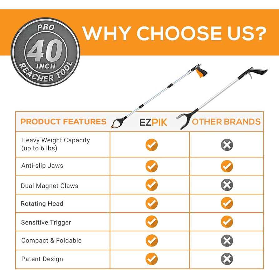 DEPENDABLE PICKER UPPER : Grabber with up to [ 5 lb load capacity ] of vertical pick up – Stick grabber won’t bend ( patented oversized latch ) MAGNETIC & EXTENDABLE : Magnetic pickup tool with [ 2 magnets ] to pick up hard to reach small metal items ( folds and unfolds in an instant ) COMPACT FOLDING : Litter picker hang on a nail and [ fit in a bag ] Portable reaching aids with a real hinge ( folds to only 14″ for storage ) ATTACH to MOBILITY AIDS : Grabber stick for disabled aids [ clip on 1″ tubes ] of disability aids ( like walking frame & wheelchair accessories ) YOUR HELPING HAND : Litter pickers for adults to extend the reach of your arm – Let the reacher claws [ safely grab ] hazardous stuff for you Choose EZPIK Extra Long Reacher Grabber 40 Inch to make your life easier Ergonomic Reachers and Grabbers for Elderly : Grab-it! Reaching tool heavy duty from EZPIK minimize strain on your wrist, helping you steadily pick small objects like pills. Safely reach high shelves with this featherlite yet collapsible reacher grabber. Pickup tool for seniors folds in an instant to save space or carry with you. Robust Garbage Grabber Tool Heavy DutyChose an appropriate length to prevent strain during extensive trash pick up. Grab tool kits often includes flimsy trash stick; Pickup grabbers from EZPIK are made of strong aluminum tubes fit for heavy duty. Trash grabber folds up with a new tougher oversized latch and its grippers are coated with durable, non-slip silicone rubber. Clever Reachers for DisabledHeavy Duty reacher clip on walker and other elderly assistance products to be used anytime. While many hip kit and knee replacement recovery aids includes reaching aids to help cope with disability, not all are easy to use. Grabber reacher tool heavy duty from EZPIK are long and lightweight, so essential items can be reached effortlessly. Some use Garbage Picker Upper – Tool to collect litter & trash – Picker upper grabber for heavy duty cleaning ops like river banks Rotating Long Grabber – Reacher tool with rotating grippers for reaching narrow spaces Prevents strain on your wrist Foldable Disability Grabber – Must haves after knee surgery or hip replacement – Recovery kit gift to improve mobility Lightweight Arm Extender – Grabber rubberized claws prevent hazard to your hand – Grabber for reaching high shelves safely Magnetic Claw Grabber – Pickup tool grabber with magnets in the tips to catch small metallic items like nails, needles…