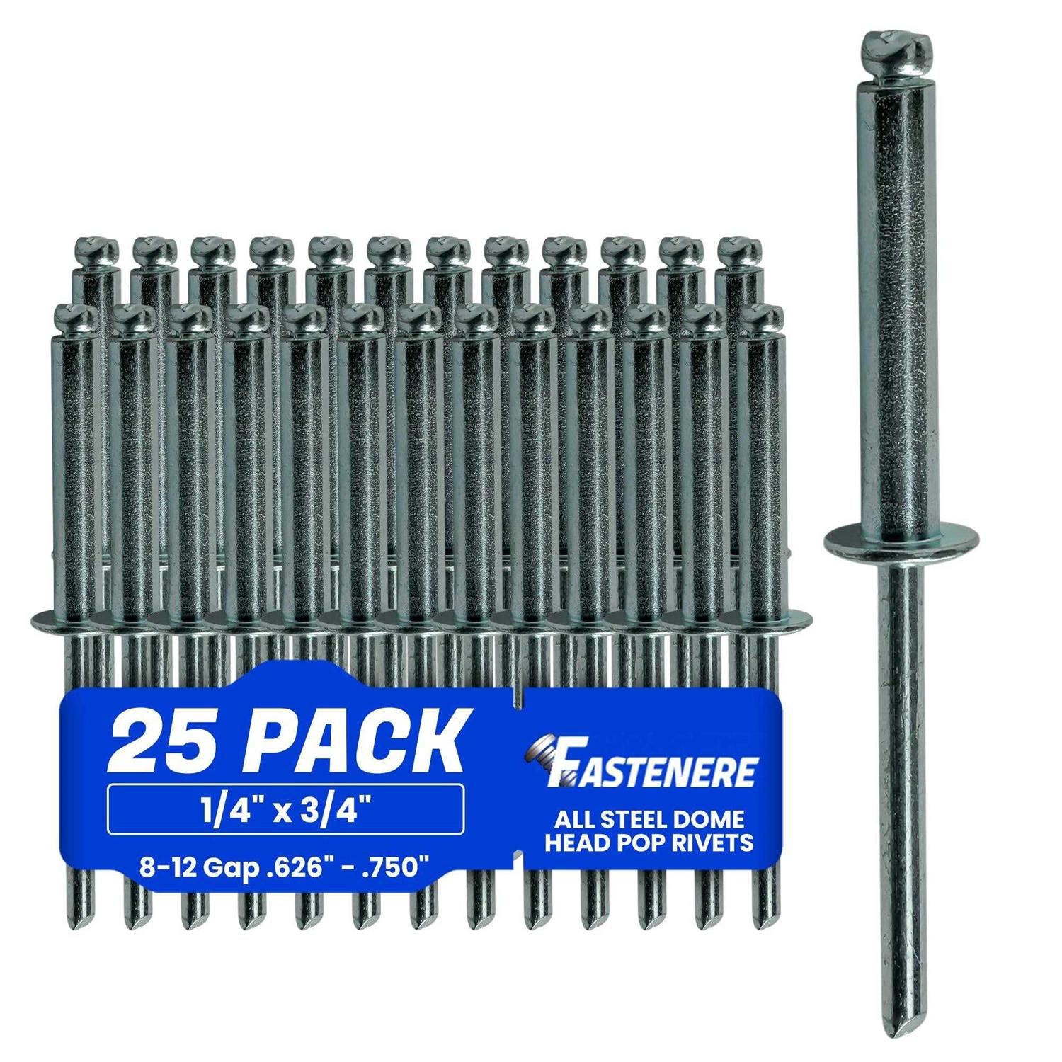 Fastenere 1/4″ x 3/4″ Dome Head Pop Rivets Steel Zinc 8-12 Qty 25