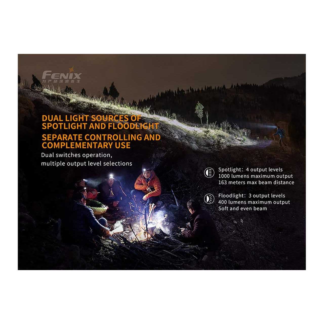 Dual Spotlight and Floodlight outputs with 1400 lumens max output. Made from lightweight magnesium with all metal housing offering 2-meter impact resistance. IP68 Dust-proof and Waterproof Rating for 2 meters up to 30 minutes. USB Type-C charging allows for the convenience of charging headlamp without removing the battery.,,Fenix Flashlights