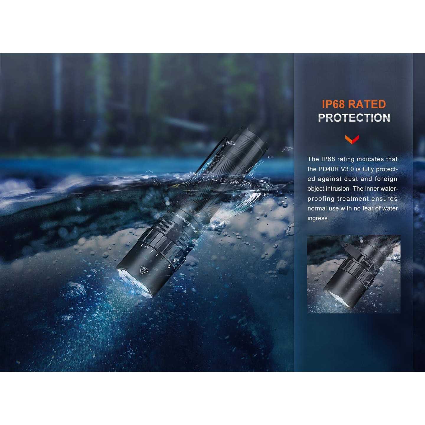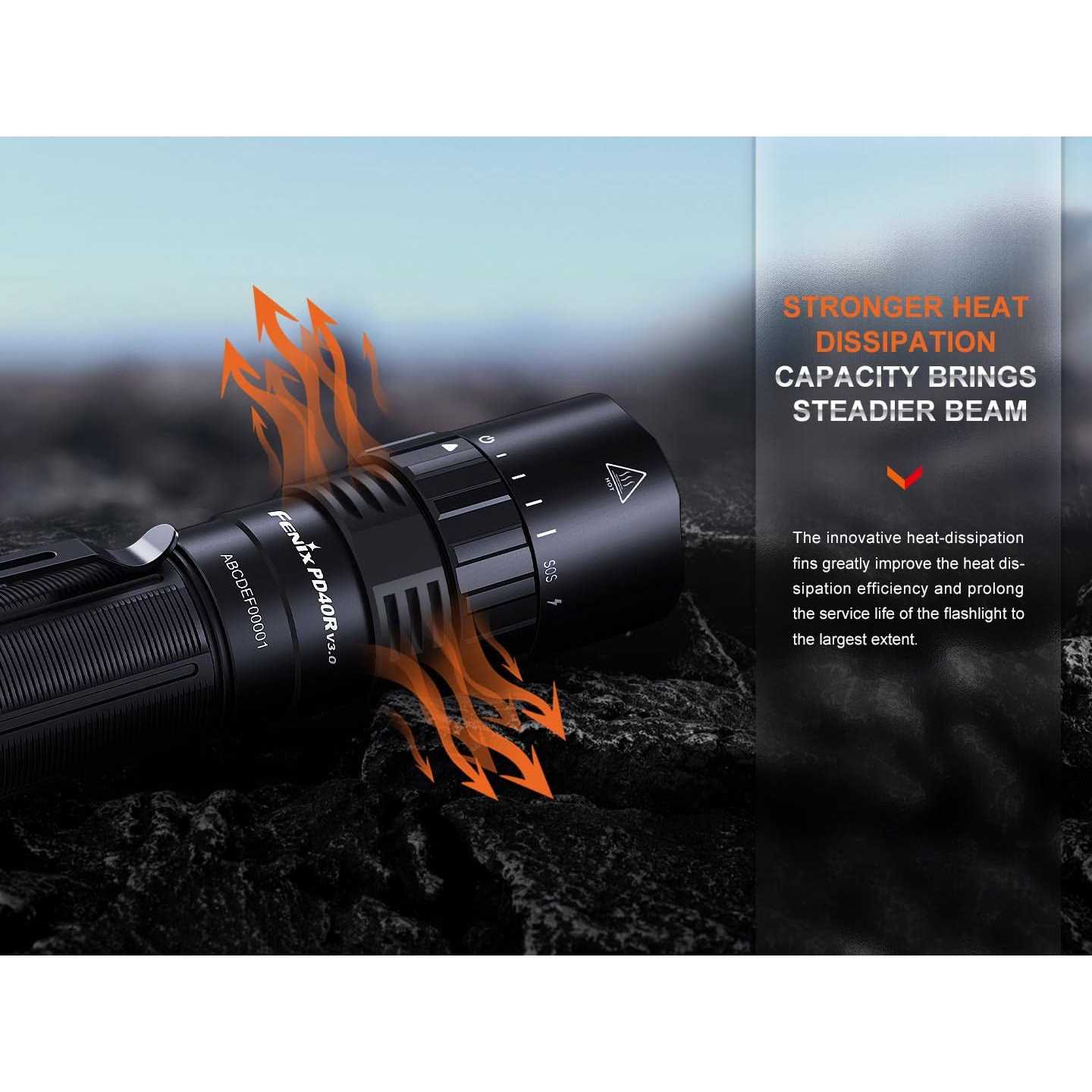 SUPER BRIGHT FLASHLIGHT -The Fenix PD40R V3.0 is capable of a super bright 3000 lumen maximum output that reaches 547 yards in distance, a 23% percent boost from the previous edition, making it an ideal duty light for professionals like law enforcement, inspection, and security. USB-C RECHARGEABLE – The PD40R V3.0 has a fast-charging USB-C port to fully recharge the included battery within 3 hours, ready to go the extra mile whenever you need it. EASY AND PRECISE CONTROL – Its mechanical rotary switch is upgraded with additional slip-resistant vertical stripes and SOS mode, improving accuracy in choosing your desired brightness and mode LIGHTWEIGHT AND COMPACT – Less than 6 inch length and 7oz weight, the PD40R V3.0 fits right in the palm of your hand while still being easy to carry around. Combining its tail stand capability with its premium quality, this is a reliable EDC Flashlight you can count on. PD40R v3.0 BACKUP BATTERY KIT – Included in this bundle is a Fenix PD40R v3.0 flashlight, 2x ARB-L21-5000 (one pre-installed, one extra), USB-C charging cable, holster, lanyard, and LumenTac Organizer The Fenix PD40R V3.0 is an incredibly powerful flashlight, boasting an impressive 3000 lumens and a remarkable throw distance of up to 547 yards, 23% farther than the previous edition. With a remarkable runtime of up to 2 hours and 40 minutes on turbo mode, it won’t let you down when you need it most. Its independent heat-dissipation fins ensure the flashlight remains cooler for longer periods. Featuring an upgraded 3rd-generation mechanical rotary switch, the PD40R V3.0 offers precise control without the worry of magnetic field interference. Its slip-resistant vertical stripes greatly improve accuracy when selecting your desired brightness level. The rotary switch smoothly transitions between Lock mode, four brightness levels, SOS mode, and strobe mode. br br The PD40R V3.0 is rechargeable and can be conveniently charged via its fast-charging USB-C port, allowing you to fully recharge the light in just 3 hours. Despite its incredible power, the PD40R V3.0 remains compact and lightweight, fitting comfortably in the palm of your hand and making it easy to carry around. Its tail stand capability, robust construction, and premium quality make it an ideal duty light for professionals in fields such as law enforcement, inspection, and security. Furthermore, it serves as a reliable companion for outdoor excursions like camping and hiking.