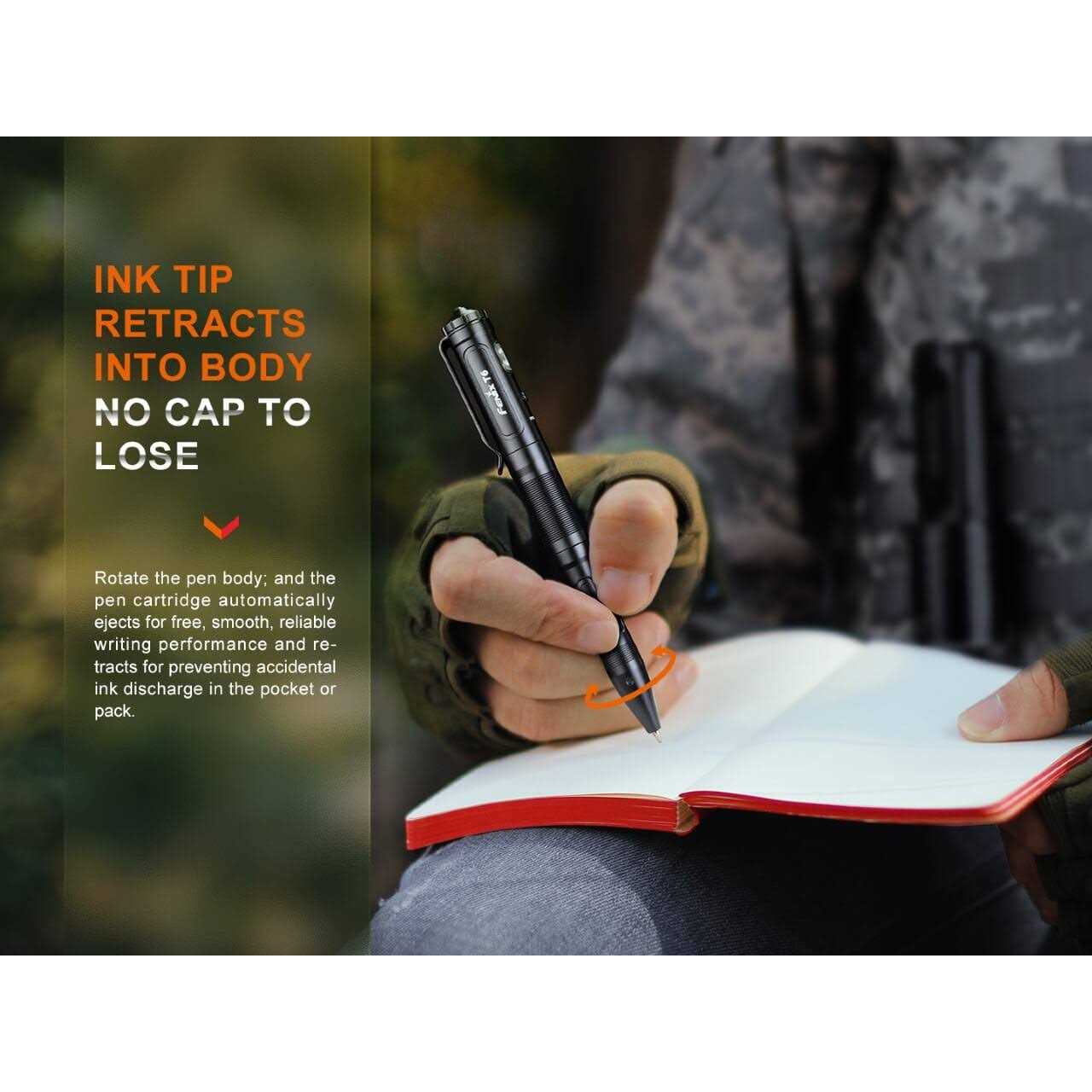 The Fenix T6 combines a high-quality tactical pen with a torch that delivers a light output of 80 lumens. The ceramic tip on the back allows you to use the torch as a glass breaker in emergency situations. Made from A6061-T6 aluminium, the Fenix T6 TacPen is robustly built and can withstand heavy impacts. It is dust and splash-proof.