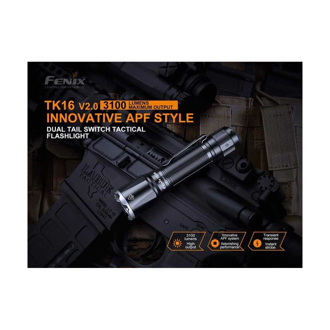 HIGH LUMEN TACTICAL FLASHLIGHT – Fenix TK16 V2 has a 3100 lumen max output and over 415 yards throw with tungsten inlay bezel, ideal duty light for patrol, EDC and search and rescue. HIGH CAPACITY BATTERY – Included is a USB-C Rechargeable battery with charging cable; over 2 hours on Turbo. ONE-HAND OPERATION – with a tactical tail switch capable of momentary-on and constant-on, and secondary tail switch for five brightness levels and instant strobe. ALL-WEATHER CAPABLE – Durable all metal construction that is IP68 waterproof and impact resistant. Can tolerate temperatures of -31 to 113 degrees F. PACKAGE CONTENTS: Fenix TK16 V2 flashlight, 2x ARB-L21-5000U (one pre-installed, one backup), USB-C charging cable, holster, lanyard, LumenTac Organizer The Fenix TK16 V2 is the latest tactical flashlight with all the bells and whistles. Capable of 3100 lumen max output, this handheld torch can reach up to 415 yards of throw. A compact tactical light, the TK16 V2 comes in under six inches, making it a perfect choice as a duty light, or everyday carry with the included carry clip, lanyard, and adjustable holster. For tactical applications the stainless steel bezel of the TK16 V2 is inlaid with tungsten impact tips, great for emergency glass rupturing. The all-weather design permits operation within extreme temperature ranges of -31 to 113 degrees, making the TK16 V2 a reliable light for the harshest of conditions.