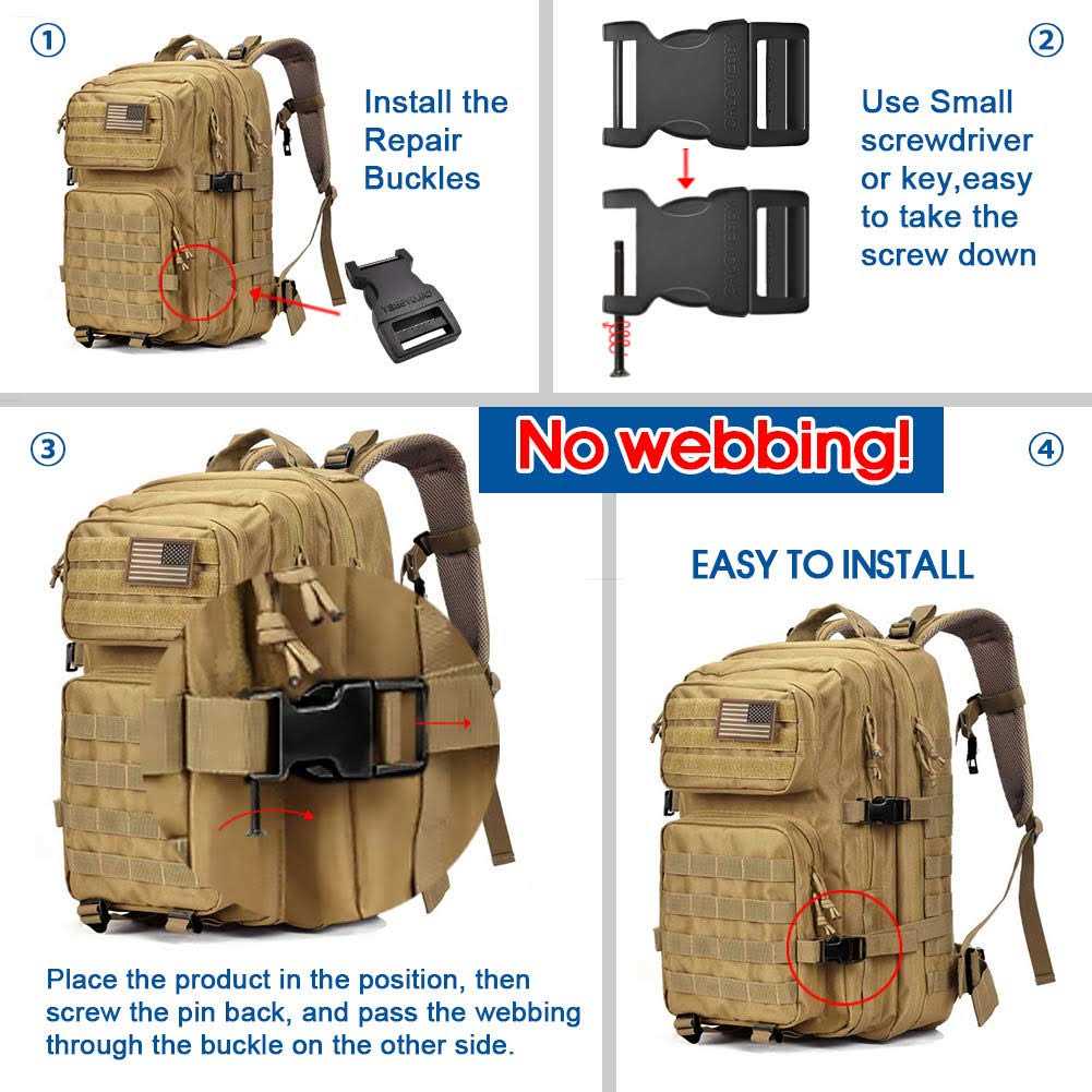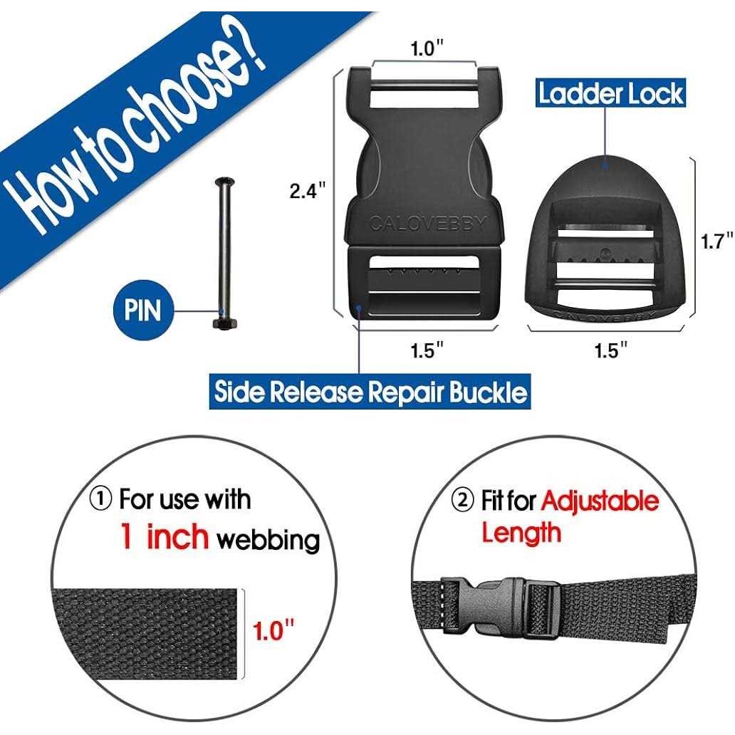 【Suitable】Fit for 1 inch wide adjustable length webbing or strap.1*Single-side adjustable buckle.1*Ladder lock.1*Pin. 【NO Sewing and Easy to Install】Single-side Adjustable. – One side remove the screw and use screwdriver to put half of the buckle into the webbing. – The other side just put the webbing into the other half of buckle. 【Thick Material】Strong plastic,heavy-duty,stays clipped under all reasonable loads. – Strong clasp. 【Wide Applications】Great for Repairing/Replacement Parts for Household Stuffs and Outdoor Equipment Such as Backpack, Pet/Dog Collar/Leash, Luggage Strap, Harness, Securing Strap, Fanny Pack, Kayak, Boat Cover, Tactical Gear, Sling, Belt, Camera Strap, parachute, etc. Indoor/Outdoor Activities Like Hiking, Camping, Climbing, Goods Bundling/Carrying/Moving, Handling Operation, Luggage-Rack Tying, Wrapping, Packing, Strapping, Tactical Gaming, etc. – Very necessary set for your home and life! 【Note】 Side Release Buckle.