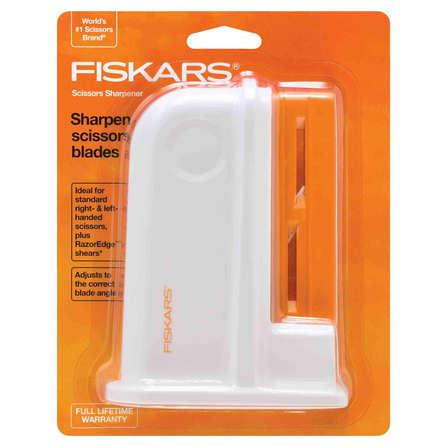 Shears sharpener universal 198620-1012 -old# 98617397j-. The Fiskars 98617397J Scissors Sharpener Machine provides an easy-to-handle and easy-to-store solution for sharpening old, dull scissors. Ideal for industries that need to cut through tough items on a daily basis, this scissors sharpener restores a sharp edge to your scissors in just a few swipes. The newly sharpened scissor edge will allow you to slice through life with ease. The lightweight Fiskars scissor sharpener is compact enough to fit in a kitchen drawer for easily accessibility. The sharpener is easy enough for use by anyone, getting blades sharp with little effort. The sharpener should only be used for right-handed scissors that do not have serrated or razor edges. Sharpeners scissors with ease. Lightweight design doesnt take up much space. Revitalize old, dull scissors that have seen too much use. Easy to use because sharpener positions scissors just right for optimal sharpening. Four to five strokes are all it takes to sharpen a pair of scissors.