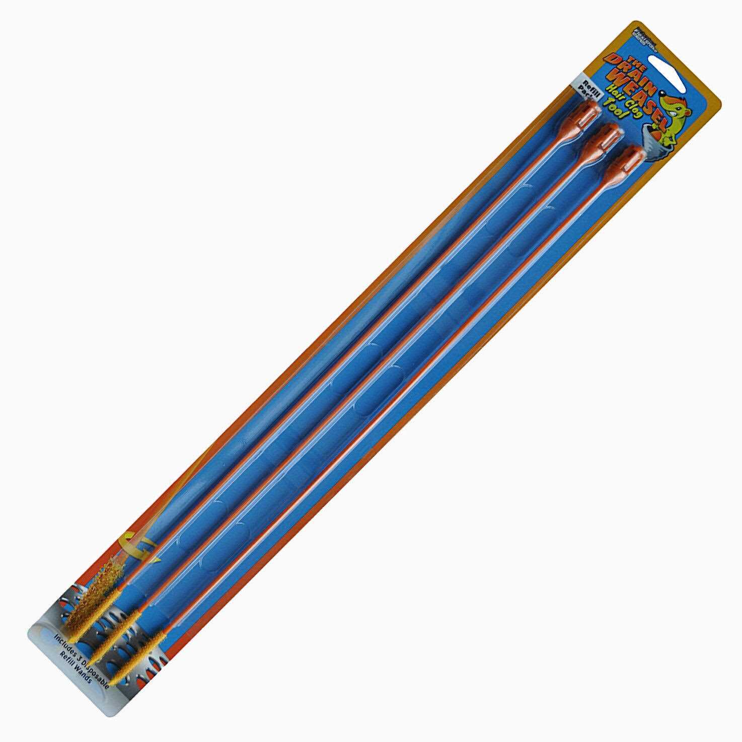 Instantly fixes hair-clogged drains. Includes 3 ultra slim hair clog wands each 18 inches in length. Each refill wand has over 100 micro hooks that grab and remove hair clogs on contact. Instantly clears hair-clogged drains in sinks showers and tubs. Quick release disposable wands. Clean hands clean drain. Slim design. Goes where many other tools cant. Drain Weasil handle sold separatley.