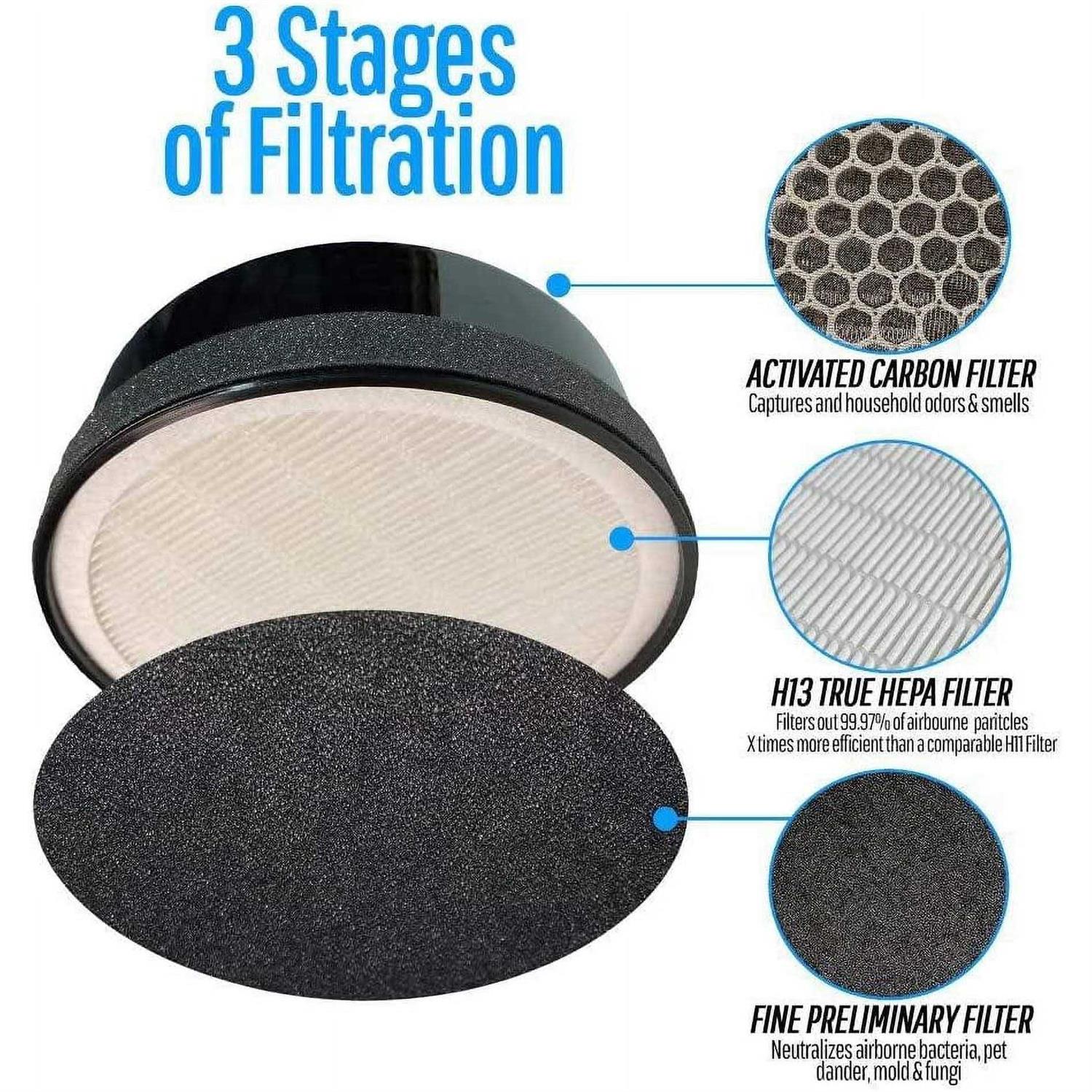 Contains Two (2) Premium 3-in-1 True HEPA Filtration System, including Fine Preliminary Filter, H13 Grade True HEPA Filter, and Activated Carbon Filter – Fine Preliminary Filter traps larger particles in the air like dust, hairs, pet fur, lint and more – High-efficiency Activated Carbon Filter absorbs household odors from pets, cooking, smoking, wildfire, and harmful VOC’s – Premium H13 Grade True HEPA Filter captures 99.97% of airborne particles down to 0.3 microns in size – Easy to replace and disposable, no tools required. Replace filters every 6 months for optimal performance.