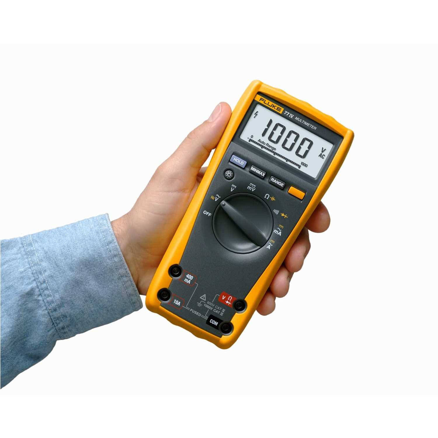 The Fluke 77-4 is an Industrial MultiMeter, 1000V CAT III. The Fluke 77-IV digital multimeter has the features needed to repair most electrical and electronic problems. This meter is simple to use and has significant improvements over Fluke’s original 70 Series with more measurement functions, conformance to the latest safety standards, and a much larger display that’s easier to view. Large display Backlight for work in dim areas Min / Max to record signal fluctuations Ergonomic overmolded housing with integrated probe holders Free your hands with the optional Fluke TPAK Magnetic Hanger Auto and Manual ranging Meets Measurement Category 1000 V CAT III and Category IV 600 V safety standards Measures: Wide 1000 V measurement range Average responding AC measurements 0.3% accuracy 10 Amps continuous (20A for 30 seconds) Frequency and capacitance Resistance and continuity.
