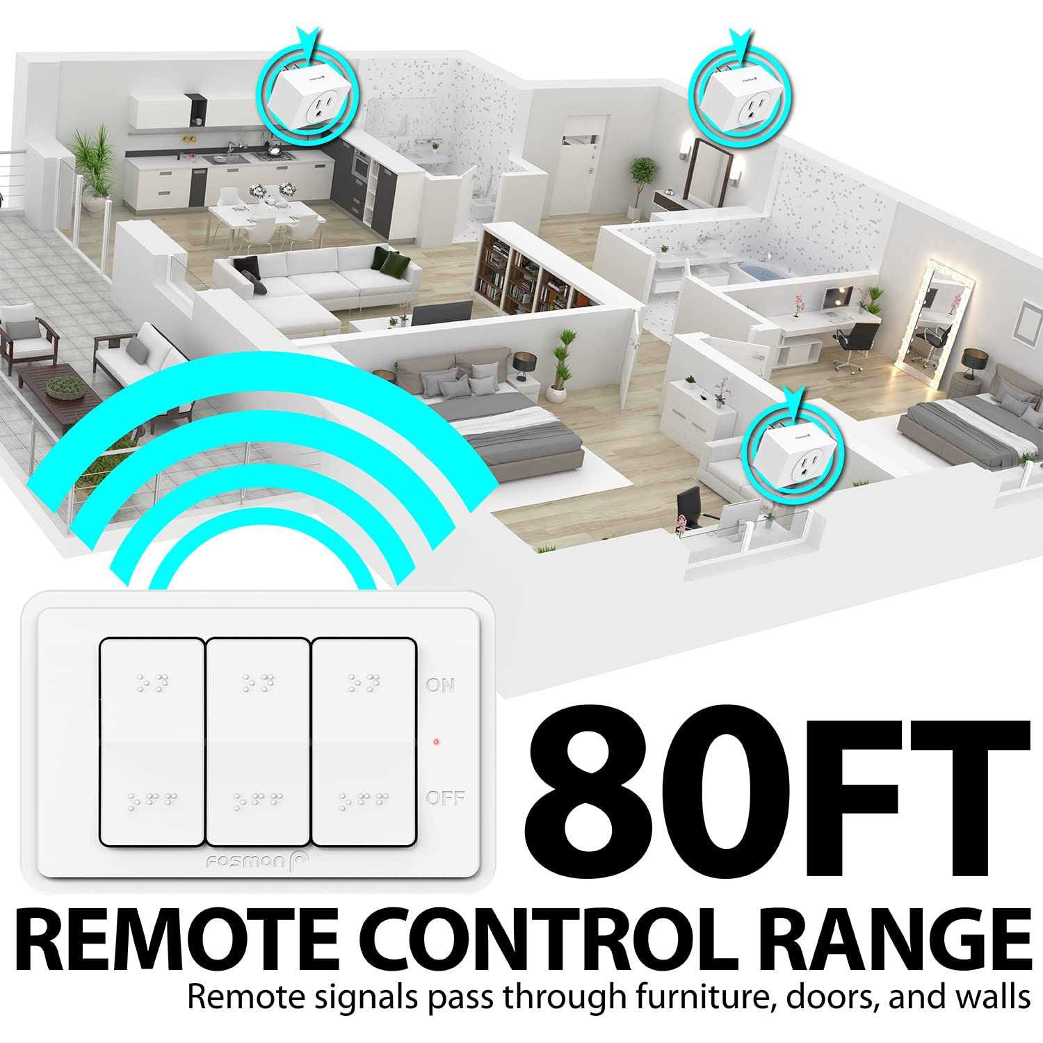Wireless Outlet with a Wall Switch The Fosmon WavePoint wireless switch allows you to easily upgrade your standard outlet to a remote controlled outlet. With this remote light switch, you can control lights, electronics, or small appliances in hard-to-reach areas. You can also mount multiple wall switches to any convenient spot, and never worry about losing the remote controls. 80FT RF Remote Control with Braille The RF remote can work up to 80 feet in an open area. When used indoors, it is able to work through walls and furniture. With the pairing technology, you can use one switch to control multiple outlets, or use multiple switches to control one outlet. The remote control can be hand-held or mounted on the wall as a wall switch. With the large Decora switch and Braille markings, it is user-friendly for the visually impaired. Compact Plug with ETL Certification Due to its compact and lightweight design, you can have the neighboring outlet available for other devices, or use two remote plugs on a duplex outlet. The safety of this remote outlet switch is certified by ETL. The plug is rated 125V 15A 1875W resistive, 1250W Tungsten, and 1/2HP. Easy Installation and Programming With this remote light switch, you are able to add a wall switch outlet without electrical wiring or hiring an electrician. You can mount the switch on a wall or place it on a table, letting you choose how you like to control your appliances. With the easy programming technology, you can set up a single pole, 3-way, or multiway switching in a few seconds. You can also turn on multiple lights with one simple click.