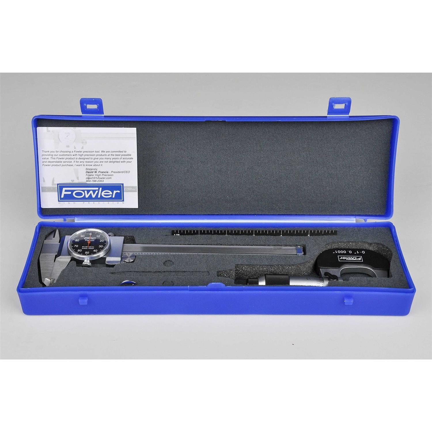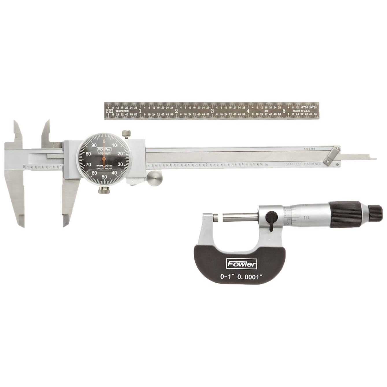 The Fowler 52-229-711-0 includes a 6 dial caliper graduated in 0.001, a 0-1 vernier micrometer graduated in 0.001 and a 6 EZ read flexible steel rule graduated in 8ths, 16ths, 32nds and 64ths. Caliper measures outside, inside, depth and step dimensions. Made of stainless steal with a shockproof gearing. The micrometer has a hardened steel spindle, ground and lapped for accuracy with carbide measuring faces. The rule has a high contrast black finish with white numbering for easy reading. Fowler, an American company, manufactures inspection and measurement instruments such as electronic indicators, calipers, bore gages and digital scales.
