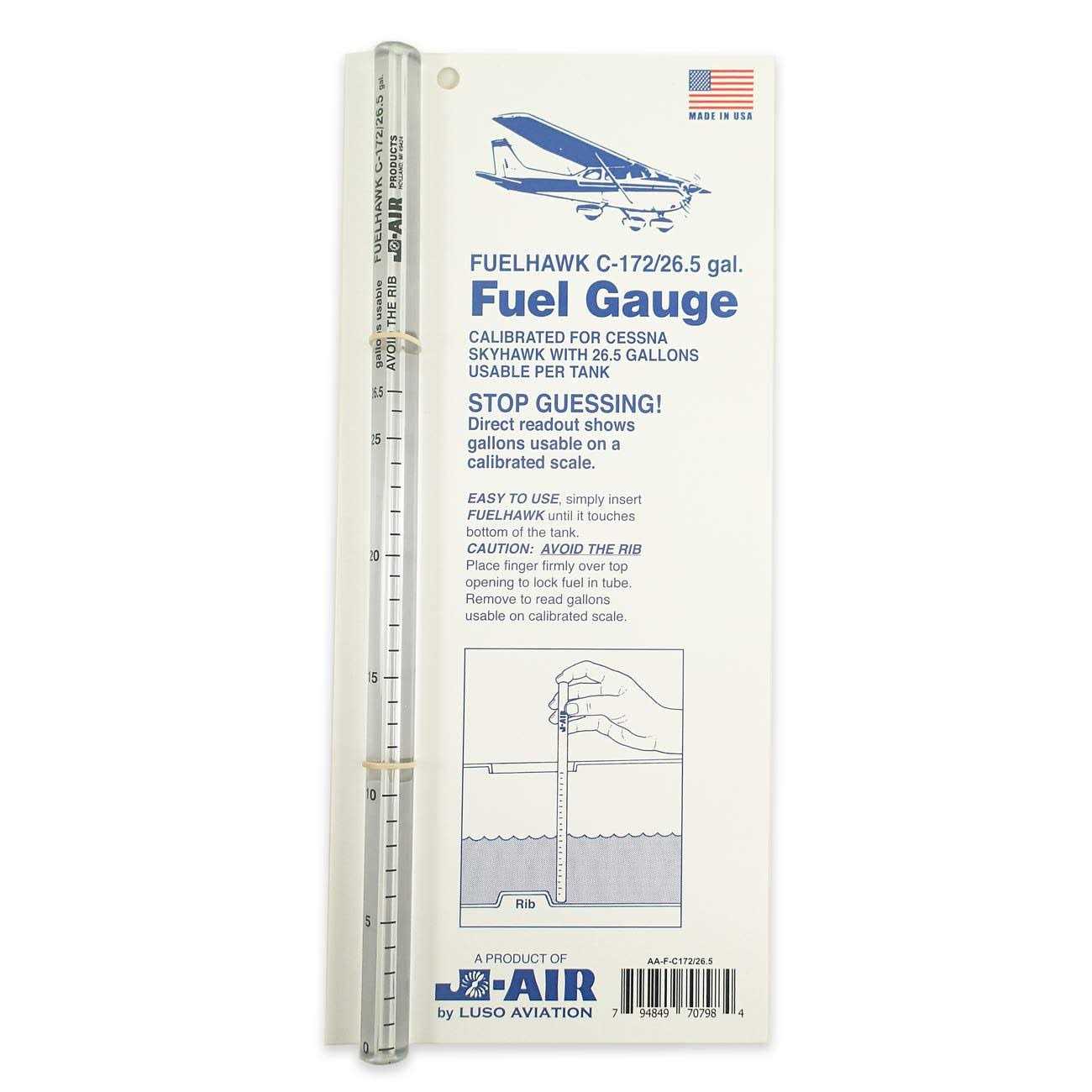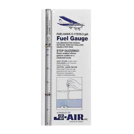 This dip stick fuel gauge is specifically designed for the Cessna 172 Skyhawk with standard tanks containing 19, 20, or 26.5 gallons of usable fuel. Please choose your size below. Made of heavy duty clear plastic that resists yellowing, fading, and cracking. Easy to Use: Simply insert the Fuelhawk until it touches the bottom of the tank. Then place your finger firmly over the top of the opening to lock fuel in the tube. Remove and instantly see how much usable fuel in U.S. gallons is inside the tank. The Fuelhawk is ideal for when the pilot must take a less-than-full fuel load due to weight considerations or measuring how much is really in the tank. Made In USA Only for use in aircraft with the specific make, model, and usable fuel capacity indicated. Aircraft must be parked on a level surface. The user is solely responsible for determining fuel on board and that Fuelhawk readings are accurate. Consult your AFM/POH for official Fuel System Information – Fuelhawk is a secondary means of estimating fuel quantity.