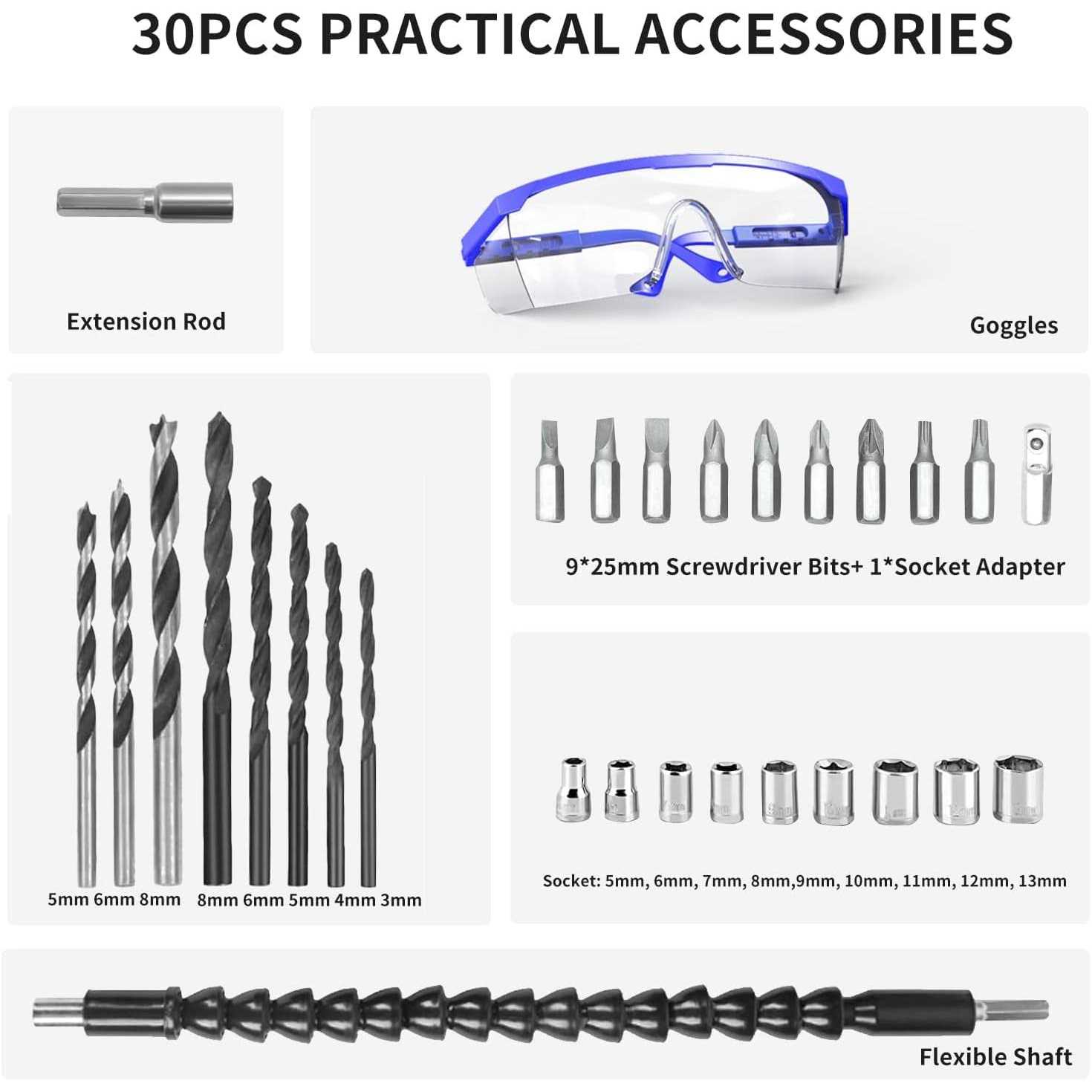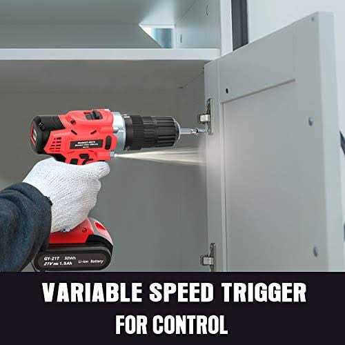 Brand: GardenJoy Color: Red Features: Top 21 volt cordless drill with fast charger. POWERFUL CORDLESS ELECTRIC DRILL KIT: The percussion drill driver is powered by a high-speed motor, providing a maximum torque of 280 in-lb. 24+1 torque position clutch can provide more precise torque adjustment as required. The 2-speed variable speed (0-450-1500 rpm) makes the drilling rig suitable for more purposes. HIGH-PERFORMANCE POWER DRILL: 3/8″ keyless chuck provides automatic spindle locking, which can be replaced with one hand, and has the greatest compatibility and durability of accessories. The variable speed trigger can be used for drilling and tightening. It is more convenient to lock the drill bit before and after using. LIGHTWEIGHT AND COMPACT DRILL TOOL: This cordless drill tool weighs only 2.02lbs, which can reduce user fatigue and easily enter narrow areas. LED lights are used to illuminate the work area in a darker area. The small and lightweight electric drill design makes it easy to operate and carry. The non-slip rubber-covered handle design allows you to easily operate with one hand, with excellent controllability and comfort ADVANTAGES AND MULTI-PURPOSE: Suitable for home improvement and DIY projects, car repair, wood, metal, plastic drilling and other tasks. You will get: 21V drilling tool assembly kit with 25 drill bit driver power tool accessories (including tile drill bits, goggles), 1 charger and operating instructions.
