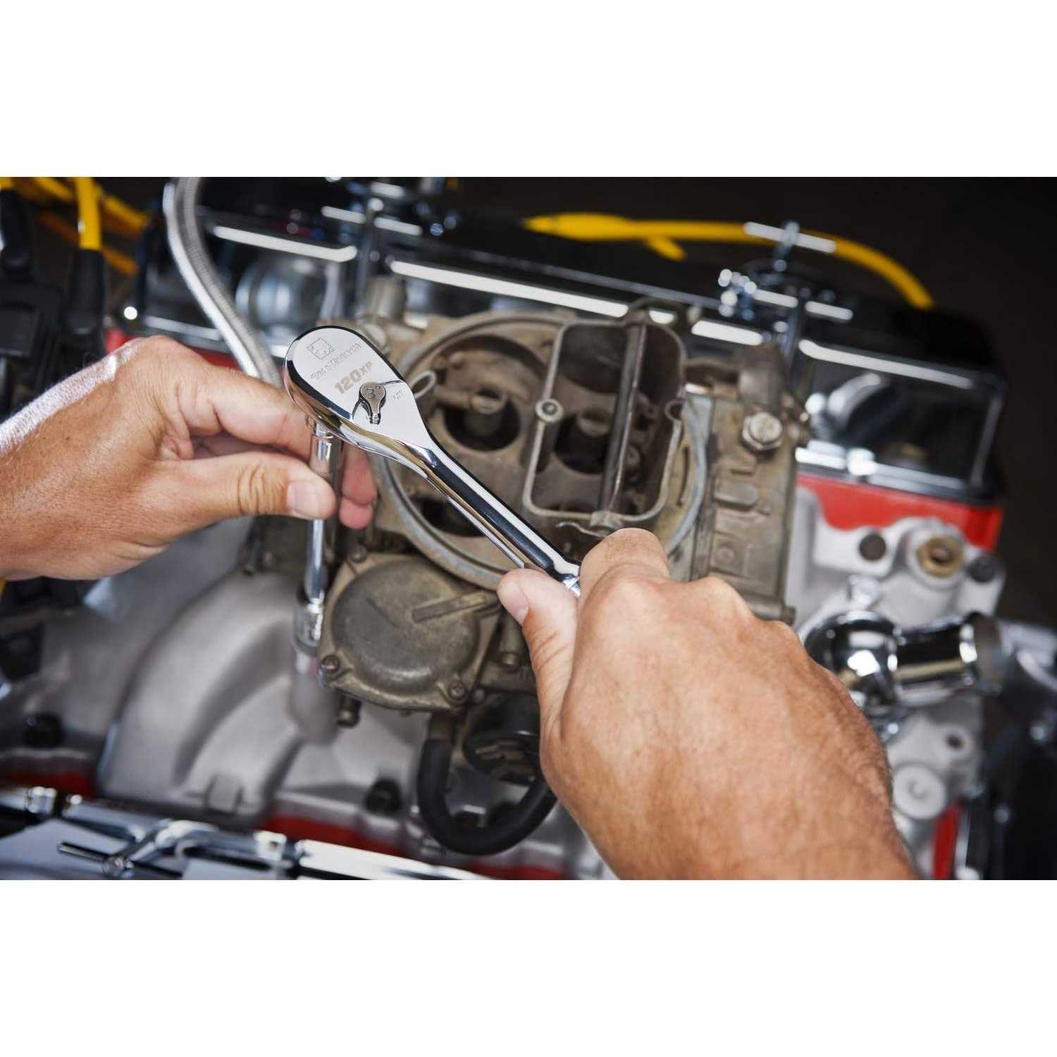 Delivering 120 rotations for every full rotation, the GearWrench 120XP ratchet is able to turn fasteners with a swing arc of as little as 3 degrees. This three-piece 120XP ratchet set (model 81206XP) includes 1/4-inch, 3/8-inch and 1/2-inch drive ratchets, and they come in a convenient, durable, custom cut foam tray to be easily stored in your tool box or tool chest. The 120XP ratchet’s Double-Stacked Pawl technology provides an ultra-narrow swing arc that enables you to reach fasteners in severely limited access applications, while still delivering exceptional strength and durability. The ratchet’s teardrop-shaped head has a low profile and flush mounted on/off switch, which also improves access in tight spaces. The long handle is ergonomically designed to provide comfort and a good grip, and it has an easy-to-clean, full polish chrome finish. It’s all All conveniently organized in a portable and durable blow mold case with removable lid for storage in your tool chest. About GearWrench Since launching the original patented 50 ratcheting wrench, GearWrench has continuously led with breakthroughs in pass-through ratchets, sockets, screw/nut drivers, pliers, and specialty tools. No matter the industry you find yourself in, GearWrench has the tools to fit your needs — from the precise to the nearly indestructable. GearWrench hand tools are warranted for life to be free of defects in material and workmanship. The Double-Stacked Pawl design delivers 120 Positions, exceeds ASME torque performance requirements and gives easy access to fasteners, delivering extreme Productivity. All three breakthrough technology ratchets come in a convenient, durable, custom cut foam tray to be easily stored in your tool box or tool chest.