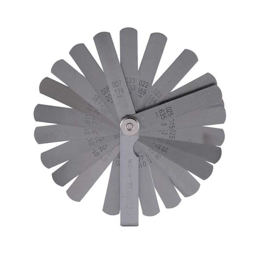 Used to measure the space between two parts. Leaves are etched with both english and metric units. Leaves are 3 long and 1/2in wide.