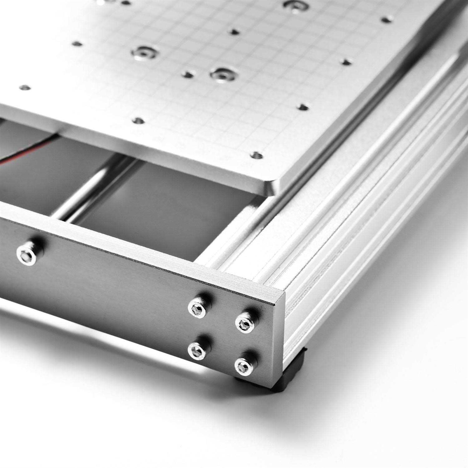 Bigger and better with an all new extra rigid and beefy design featuring an increased Z Height of 72mm dual steel X axis guide rails, all aluminum spindle holder and 300W spindle. All these upgrades make metal carving easier, ideal for an endless variety of drilling, and carving operations on various metals, like brass, copper and 6061 aluminum, etc. Upgraded linear guide structure and 4040 Y axis profiles highly improve the engraving accuracy and processing strength, eliminating Z axis wobble issues that most other desktop CNC machines have. One-piece machined and molded aluminum design ensures flatness and strength of the work platform. Integrated measurement scale is convenient for material positioning. The platform is compatible with most of the CNC clamps on the market. Everything you need out of the box. The pre-assembled module of XZ Axis Gantry and Base Assembly reduces the effort of assembly. You just need 3 main installation steps and wiring to start carving your projects. All stepper motors are equipped with manual jog wheels making it easy to adjust and position your spindle or stock material.