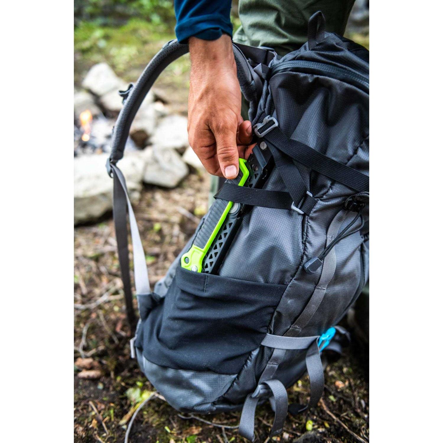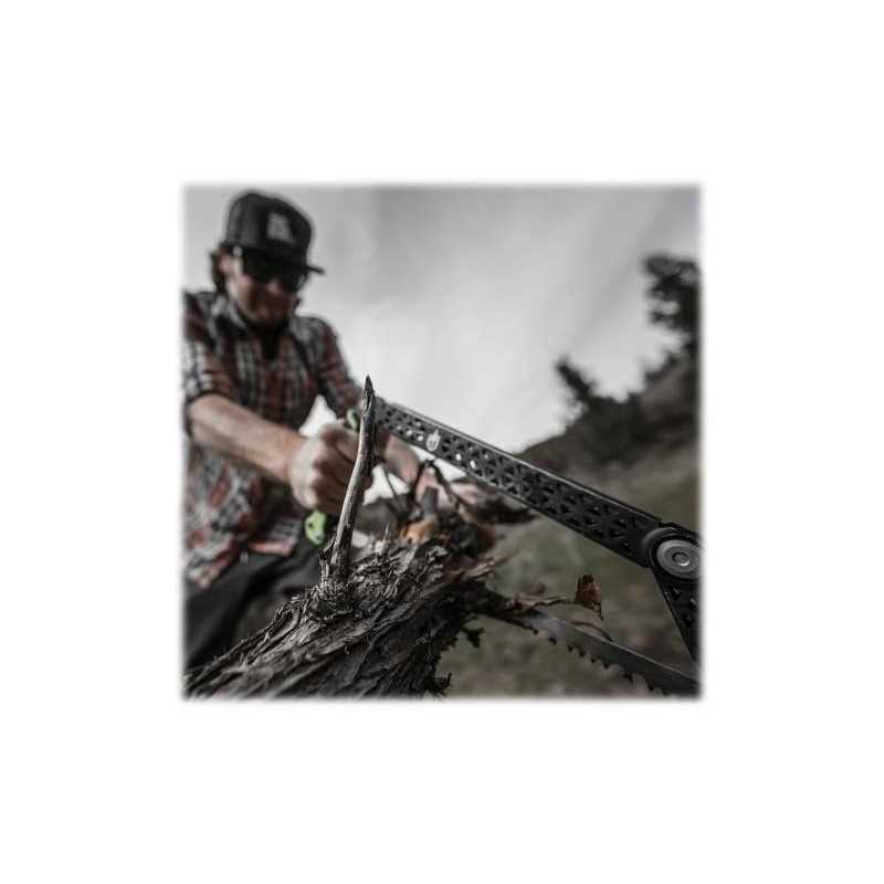 Freescape Camp SawGerber The Freescape Camp Saw features an innovative design that allows the saw to fold up flat while remaining completely assembled and without threat of lost parts. It utilizes 4 pivot points to effectively cut larger diameter wood while using the full length of the blade. When folded up, the blade is protected and can be stowed safely in a gear kit or camp bin. Bright Accents for Quick Visual ID Its bright green accents along the black rubber surface make it easy to spot in the shuffle of camp gear. The grippy rubber Freescape textured handle stays firmly in the hand no matter the conditions. Replace the saw’s standard 12” blade easily if required.
