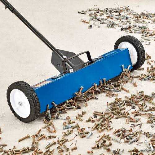 These manual push magnetic floor sweepers allow easy metallic debris pick-up on virtually any floor surface. Magnetic sweepers help get rid of damaging steel, nails, wire, screws and other metallic debris. Simple-to-use magnetic sweepers automatically pick up steel objects to provide an alternative solution to brush sweepers, vacuums and power sweepers. Can be used over asphalt, concrete, grass and gravel. Handle and roller bearing wheels allow easy push-broom style sweeping over hard floor surfaces and rough terrain. Features a load release lever for easy removal of debris. Includes 7 wheels and a removable handle for easy storage.