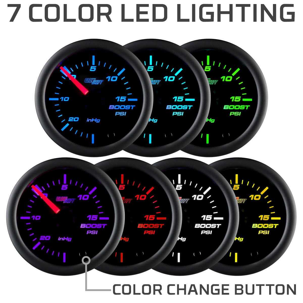 This boost gauge is mechanically driven and reads boost pressure from 0 to 15 PSI as well as vacuum compression levels from -30 to 0 inHG. Included with each 15 PSI Boost Gauge is 6′ of silicone vacuum hose with a T-fitting that allows you to tap into any vacuum line on the vehicle to get those boost readings. This gauge also comes included with all necessary mounting hardware, gauge visor and 2′ of power wiring. br br This 2 1/16” Black 7 Color 15 PSI Boost Gauge features a magnified clear lens, black face with an illuminated red needle and utilizes GlowShift’s signature 7 color LED through dial lighting. This allows you to easily select from 7 different solid color modes that include blue, green, red, teal, yellow, purple, white, as well as a color cycle and color fade mode by pressing the button on the gauge face. With the included color recall feature, you won’t have to worry about setting the gauge to your preferred color every time you power your car on. Connecting the orange wire of the gauge to the factory headlight switch source allows the gauge to dim 30% for easier viewing when driving at night.