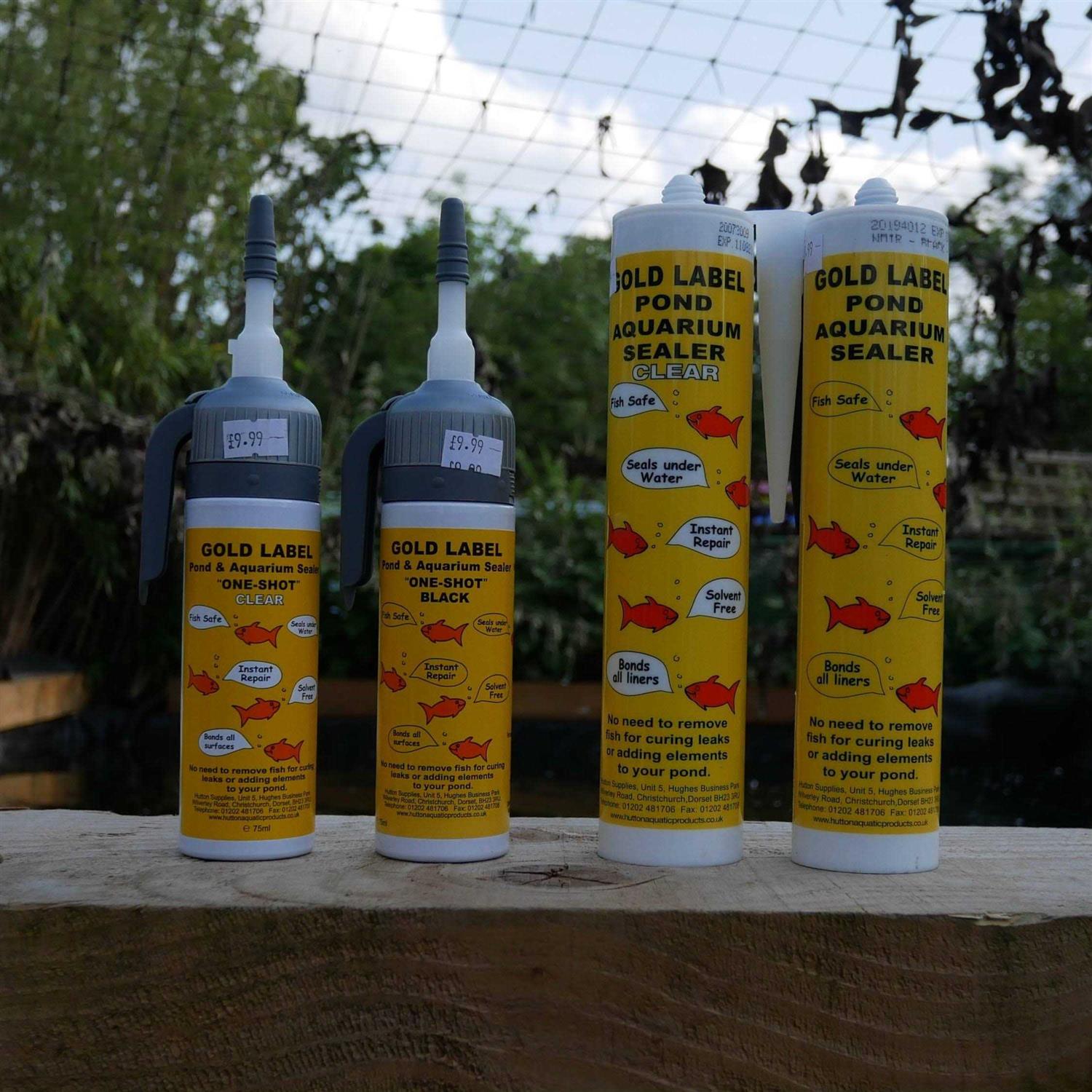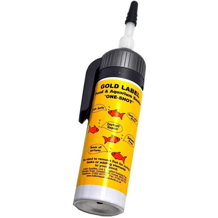 No need to remove fish for curing leaks or adding elements to your pond. Bonds to butyl rubber, glass, plastic, ceramic, stone, wood. Also bonds to concrete with suitable primer. 75 ml bottle. Fish safe Seals under water Instant repair Solvent free Bonds to all surfaces For best results, clean all surfaces to be free of algae, etc. Pump sealer onto surface to be bonded. Can be used on wet or dry surface and will cure underwater. Do not use on surfaces or in temperatures below 10 degrees C. For strongest bond, pipe minimum 10 mm wide band around patch and press lightly onto repair area. Do not squash flat as this will impair adhesion. Where there is livestock near the sealer, protect from ingestion while curing.