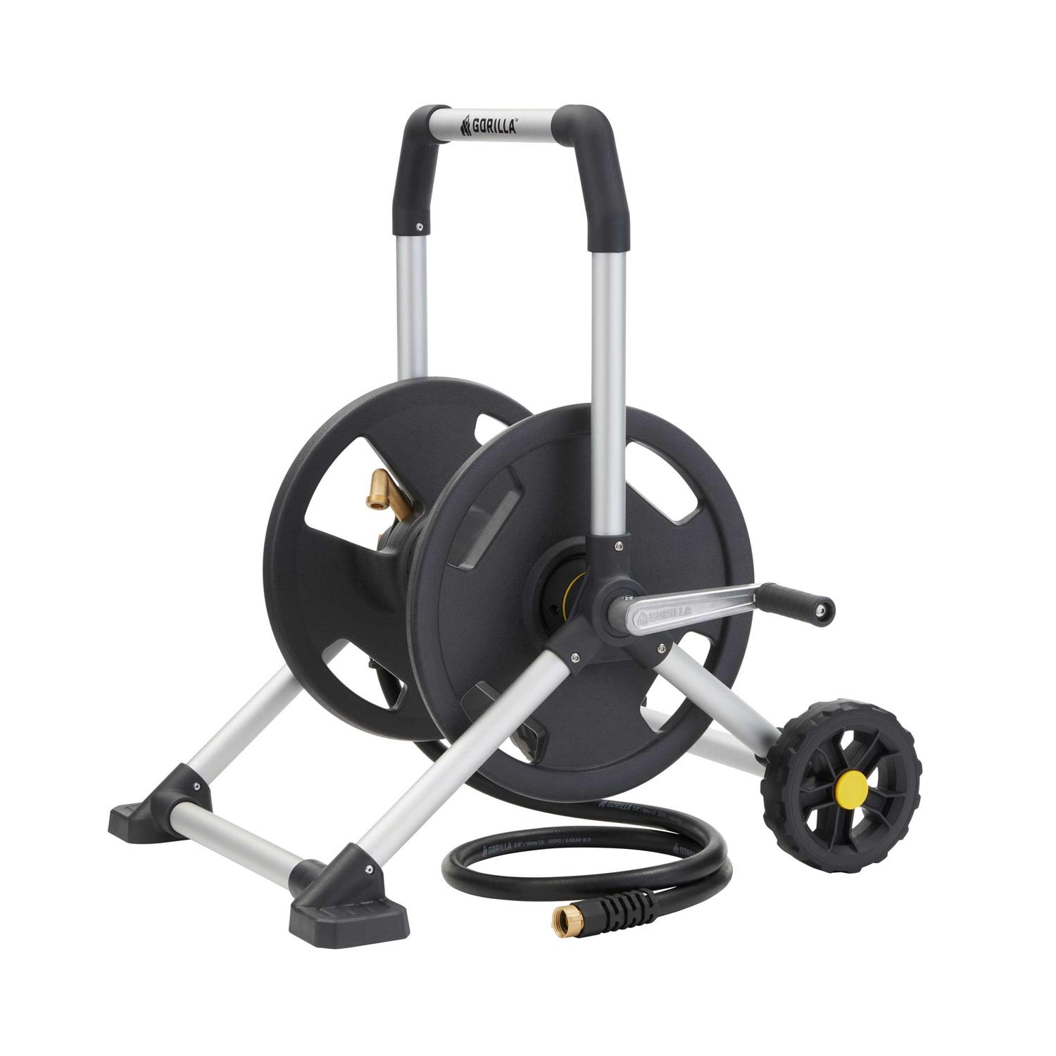 Reels by Gorilla Carts. Details:The all-new Gorilla 200 ft. Zero-Rust Upright Hose Reel is built to last and designed to withstand years of heavy duty use and weather conditions. The upright comfort handle and 7 in. over-molded wheels are designed to give you the maneuverability you need on any terrain and the wide base provides great stability. Easy access connections and torque-tight fittings simplify the loading and unloading of up to 200 ft. of hose. The Gorilla Upright Hose Reel is the perfect, long-lasting solution for any home.